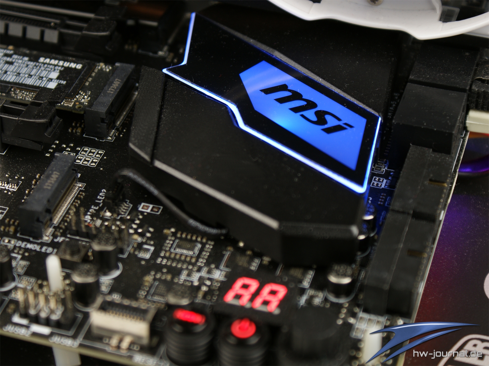 Der Chipsatzkühler baut sehr flach, um Kollisionen mit verbauten Grafikkarten zu vermeiden. Um die Optik etwas aufzulockern ist auf der Oberseite ein spiegelndes Element angebracht worden, welches im Betrieb auch zum Leuchten gebracht werden kann. Gleiches gilt für die I/O-Blende. Das Muster, welches etwas an Sonnenstrahlen erinnert, findet man so auch im BIOS wieder.