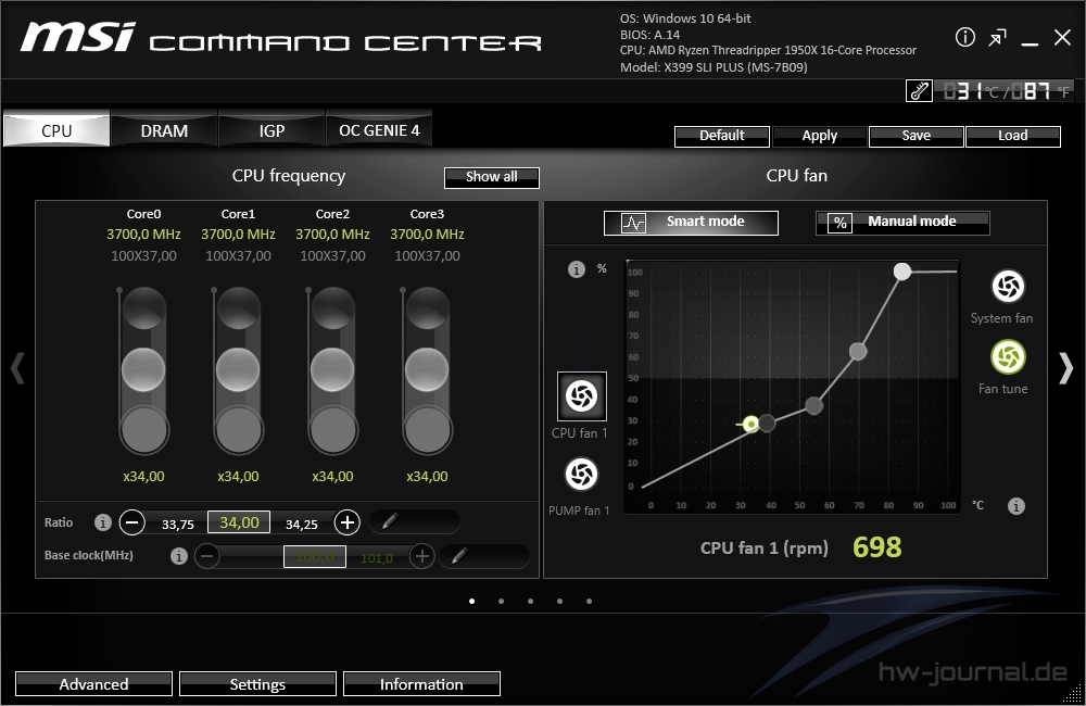 Beim vorliegenden Mainboard gibt es wieder, MSI typisch, verschiedene Heransgehensweisen. Zum einen kann man den klassischen Weg bestreiten und die Änderungen im BIOS vornehmen. Etwas eleganter und vielleicht auch zeitgemäßer ist aber die Nutzung der AMD Ryzen Threadripper Master Software. Hier kann man Änderungen in Echtzeit während des Windowsbetriebs vornehmen. Noch einmal einfach ist es, die spezielle MSI Lösung zu wählen. Den MSI Gaming Boost haben wir bereits auf etlichen Mainboards angetroffen. Man kann hier entweder per Drehregler auf dem Mainboard oder aber auch virtuell in der Software oder im BIOS verschiedene Leistungsstufen wählen, welche wiederrum immer einen bestimmten Takt vorgeben.