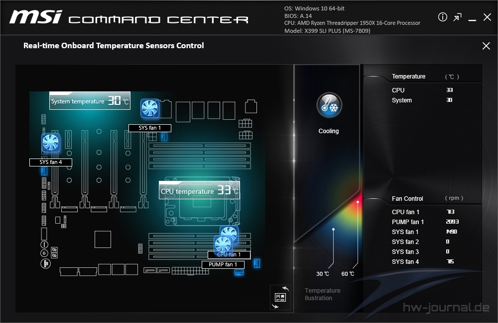 Das von den anderen aktuellen MSI-Mainboards bekannte (z. B. MSI X299 XPower Gaming AC) Command Center kommt auch beim MSI X399 SLI Plus quasi in unveränderter Fassung wieder zum Einsatz. Die Features und Stellregler sind ziemlich identisch, jedoch wurde das Farbdesign von rot und grau geändert. Also warum etwas ändern was gut funktioniert und läuft? Mit dieser Software hat der Anwender die Möglichkeit, die integrierte Lüftersteuerung leicht und zugänglich zu steuern. Mal auf die reine Funktionalität beschränkt, kann die Software von MSI als sehr zugänglich, funktional und einfach zu handhaben verstanden werden. Lüfterkurven können per Graphen angelegt oder feste Drehzahlen in PWM-Stufen fixiert werden. Zudem erhält man eine grafische Übersicht, wie die aktuellen Temperaturen auf dem Mainboard vorliegen.