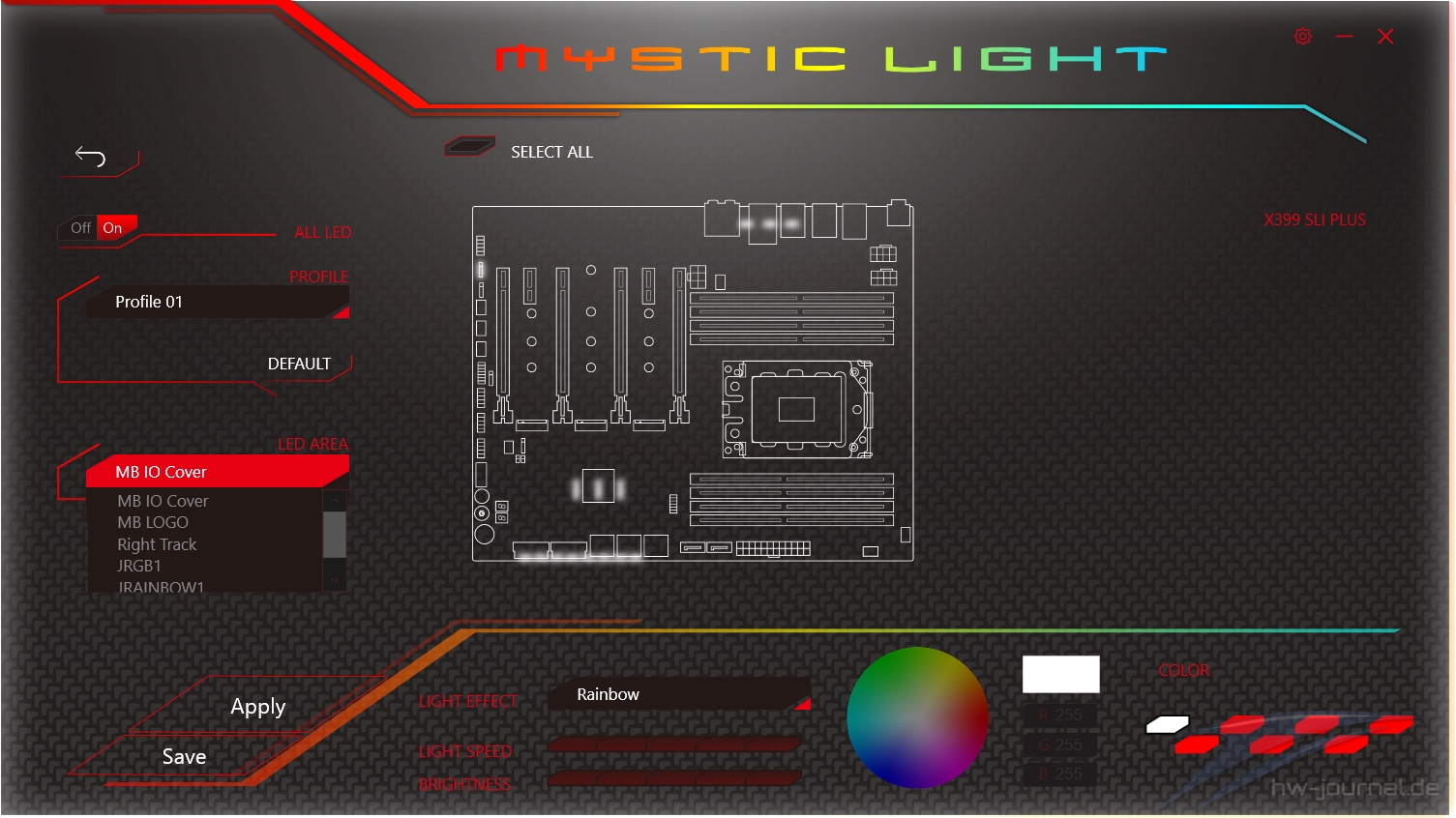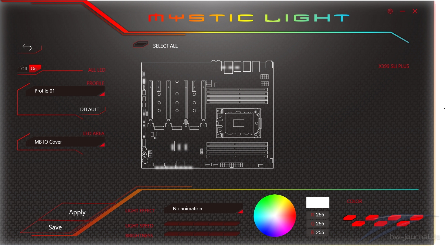 Wir hatten Anfangs bereits erwähnt, dass das SLI PLus auch auf dem Mainboard über RGB-Zonen verfügt. Im folgenden sieht man eine einfache Farbdartellung zur Ortung der Bereiche. Konkret ist der Kühler des Chipsatzes und die I/O-Blende mit einer Beleuchtung versehen. Zudem befinden sich auf der Rückseite des Mainboards auf höhe der SATA Anschlüsse mehrere RGB LEDs, welche einen Hintergrundbeleuchtung erzeugen. Per Mystic Light sind insgesamt 17 Effekte und 16.7Mio Farben möglich. Die Steuerung kann dabei über die Software am PC erfolgen oder aber per App am Smartphone.