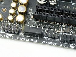 Trotz des geringen Platzes ließ es sich MSI nicht nehmen den OnBoard Taster und den Gaming Boost Drehregler auf der Platine zu platzieren. Auch eine 2-Digi Debug Code LED wurde angebracht, sodass man neben dem Debug LEDs, eine weitere, noch genauere Anzeige bei etwaigen Problemen hat. Auch der USB 3.1 Gen.2 (10Gbps) Header für die Front ist hier vorzufinden. Des Weiteren wurden zwei USB 3.1 Gen.1 (5Gbps) sowie zwei USB 2.0 Header verbaut. Der untere Rand der Platine stellt weiterhin drei Fan-Header bereit, sodass man insgesamt vier System-Fan-Header, einen Pumpen-Header sowie einen für den CPU-Kühler nutzen kann. Um die RGB Beleuchtung des Mainboards zu erweitern, stehen zwei RGB-Header bereit. Bei einem handelt es sich um den regulären 5050-Header für 12V LEDs, der andere ist uns in dieser Form neu. Er händelt 5V LEDs, welche scheinbar zwei Datenleitungen aufweisen. Wir halten hier noch Rücksprache mit MSI, welche Produkte hierdurch unterstützt werden. Der Hersteller hat aber insoweit mitgedacht, dass der 12V Anschluss zunächst mit einer Kappe versehen ist, damit man nicht versehentlich einen 5V Strip durch Überspannung zerstört.