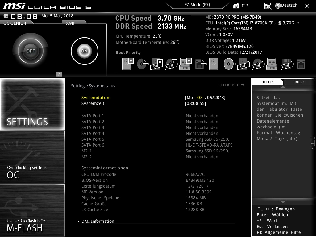 Auch das MSI Z370 PC PRO kommt bzgl. des BIOS ohne Überraschnug daher. Das MSI Click Bios 5 wird über alle Plattformen hinweg verwendet. Wozu sollte man die übersichtliche Strukturierung auch aufgeben. Vorteil ist auch, dass man sich auch schnell zurechtfindet, wenn man vorher ein System mit anderem MSI Mainboard betrieben hat. Den Anfang macht also auch hier eine reduzierte Oberfläche, welche jedoch nicht nur Informationen zu den wichtigsten Komponenten liefert, sondern auch Einstellungen zulässt. Was einem auch direkt ins Auge springt, sind die beiden Buttons für den OC Genie 4 und das XMP Profil. Ohne lange zu suchen, kann man den extra Boost also jederzeit aktivieren.