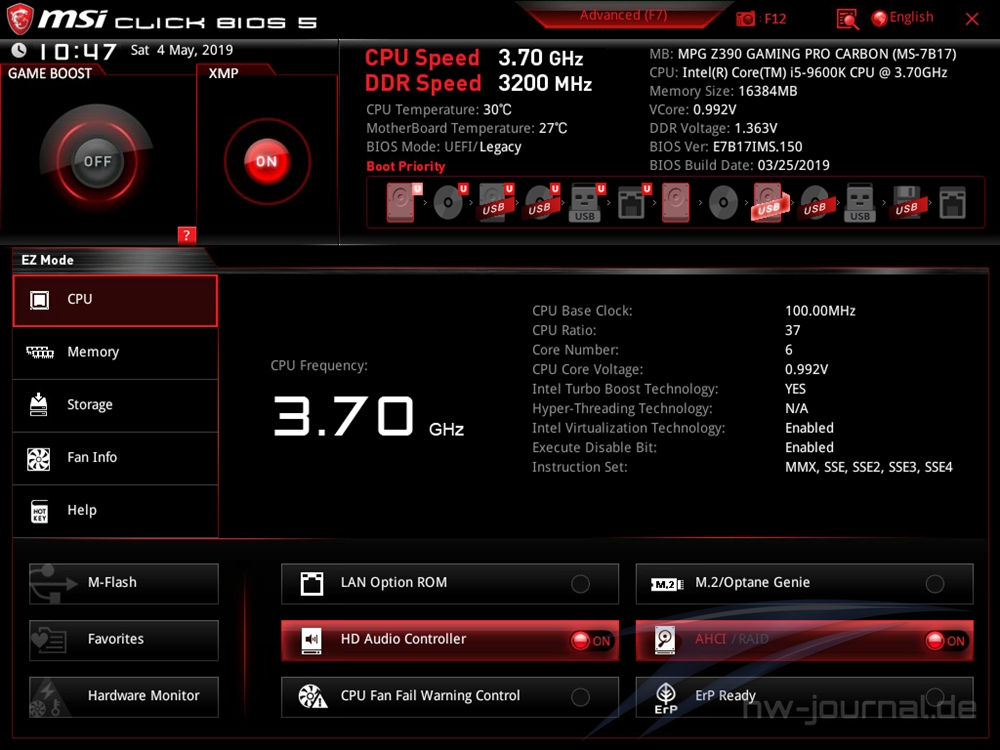 Beim Bios hat sich an sich seit einigen Generationen nichts mehr am generellen Aufbau geändert, was sich auch drin zeigt, dass seit dem Wechsel von Z97 zu Z170 Chipsatz weiterhin das sogenannte Click Bios 5 statt 4 verwendet wird. Auch bei Mainboards anderer Sockel (vg. z B. MSI X299 Gaming M7 ACK, MSI X399 SLI Plus und MSI B450M Mortar) wird das gleiche Prinzip benutzt, wodurch man sich Plattformübergreifend immer schnell zurechfindet. Bereits im sogenannten EZ Mode sind ein paar grundlegende Einstellung zu treffen und mehrere Informationen einsehbar.