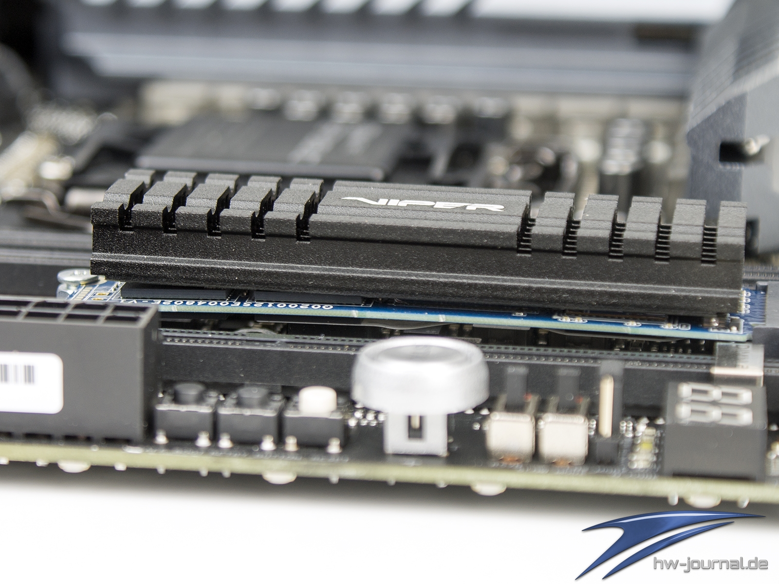 Angedeutet wurde, dass sich die M.2 Slots etwas verstecken. Würde der Schriftzug des Kühlers nicht darauf hinweisen, könnte man glatt übersehen, dass sich zwischen den RAM- und dem DIMM.2-Slot zwei Steckplätze für NVMe SSDs befinden. Diese können 42 bis 80mm lang sein und teilen sich bei der längsten Auslegung eine Schraube zur Arretierung. Anschließend kann man den Kühler mit zwei weiteren Schrauben anbringen. Dies jedoch nur dann, wenn die SSD keinen eigenen Kühler besitzt. Die Patriot Viper VPN100 zeigt dies exemplarisch. Aufgefallen ist beim Verbauen der beidseitig bestückten SSD zudem auch, dass diese aufgrund des Gummi-Quaders auf dem Mainboard zum Durchbiegen verleitet wird.