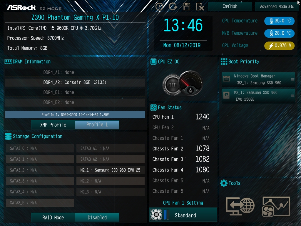 Der Startbildschirm des ASRock Z390 Phantom Gaming X ist Serienmäßig der Easy Mode. Hier sind eingentlich alle wichtigen Funktionen auf eine Seite gequetscht. Ähnlich macht es ja auch MSI mit dem EZ Mode. Konrekt kann man beim Mainboard hier das XMP Profil des RAMs aktivieren, einen Raid Mode für Laufwerke festlegen, wobei man alle angezeigt bekommt, die Boot-Priorität festlegen und ein Lüfterprofil festlegen. Dabei werden die wichtigsten Temperaturen (CPU; Mainboard) sowie die Drehzhalen der angeschlossenen Lüfter angezeigt. Zudem kann man hier bereits eine One-Click-Übertaktung durchführen. Unten rechts unter Tools kann ein Bios Update angestoßen werden (via Internet oder Stick) sowie die FAN Tastic Funktion genutzt werden.