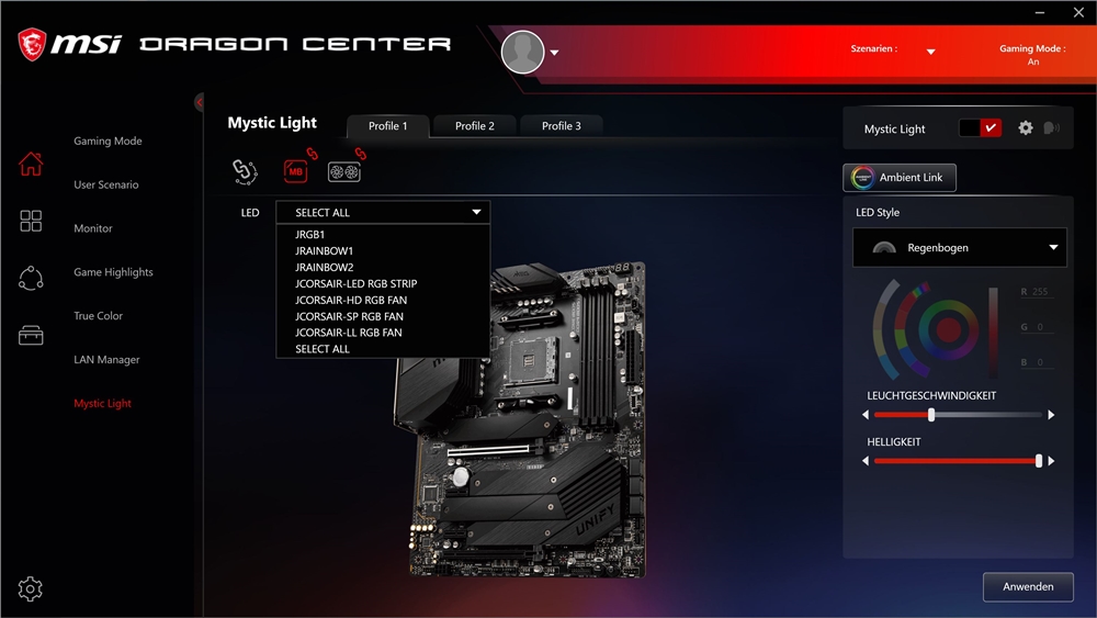 Als Software kommt das Dragon Center zum Einsatz. Hier zeigt sich, dass MSI den Creator Mode wohl jetzt auch bei den Gaming-Platinen eingefügt hat und diesen nicht mehr nur den sogeannten Workstation-Boards vorenthält. Ansonsten gibt es keine Überraschungen in der Software. Es lässt sich wie immer etwas an den Einstellungen der CPU feilen, die Lüftersteuerung lässt sich hier konfigurieren und auch die Beleuchtung kann hier eingestellt werden. Zudem lässt sich das Netzwerk überwachen und etwas optimieren.