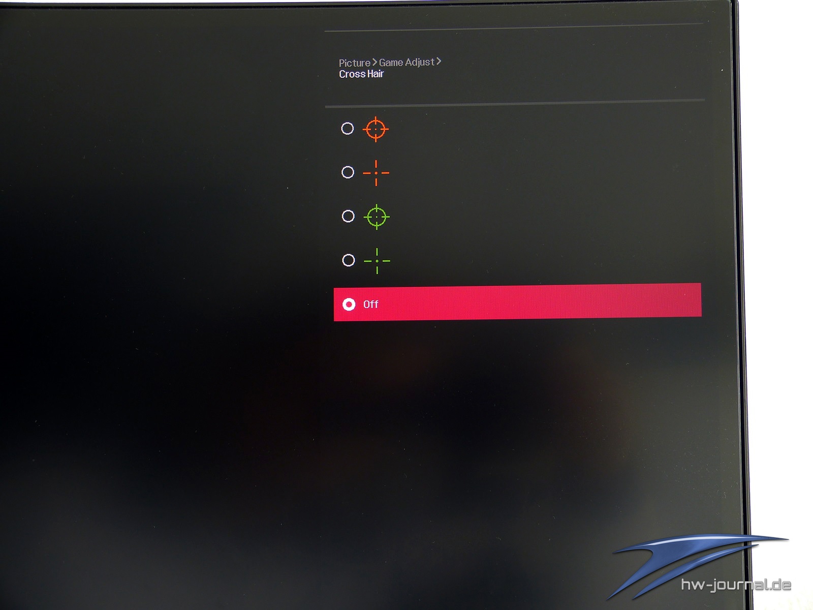 Die Einstellungen am Gerät selbst werden, wie weiter vorn angesprochen, mit einem Steuerstick an der Unterseite des Chassis vorgenommen. Rechts und links davon befinden sich auch die beiden kleinen „Lautsprecher“. In den Menüs findet man hier nochmal mehr Settings vor, als es die o.g. Software einem anbietet. Dazu zählen auch mehrere Crosshair`s – interessant daran, in den Anfängen der Online-Shooter hat man sich die Punkte mit einem Edding auf die gute alte 19 Zoll Röhre gemalt, auch wir! Nun kann man es per Software hinzuschalten.