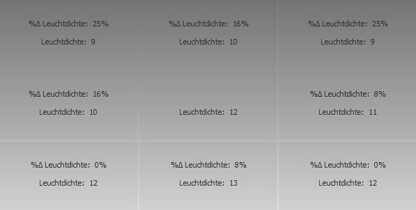 Zu beobachten ist eine Tendenz, dass wenn man immer weiter nach oben geht, nicht nur die Abweichung zunimmt, sondern auch die Leuchtdichte an Stärke verliert. Die größte Abweichung wird beim dunklen Bild mit 25% im oberen Drittel gemessen. Geht man das Kachelsystem jetzt durch, sind alle Bereiche auf ihrer Ebene aber gleichmäßig ausgeleuchtet, was in der Praxis dazu führt, dass man keine hässlichen Lichthöfe im Bild hat.