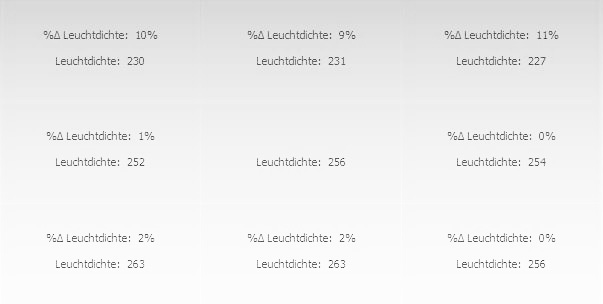 Die Bildhomogenität wird in drei Abstufungen (Weiß – 255, Grau- 128 und Dunkel-63) bei maximaler Helligkeit geprüft. Im Ergebnis werden dann etwaige Farbabweichungen in den jeweiligen Bereichen sichtbar. Auch kann aufgezeigt werden, ob das Panel gleichmäßig ausgeleuchtet wird.