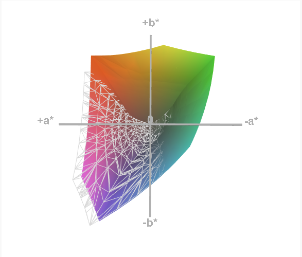 Wie gut die Darstellung des sRGB-Farbraum vom jeweiligen Monitor abgebildet werden kann, kann von unseren 3D-Grafiken abgelesen werden. Die Messergebnisse werden dazu in einem sogenannten ICC-Profil abgespeichert und so können wir mit einem entsprechendem Viewer (ICC-View) ein Modell dazu erstellen. Es kommt wieder das bereits o.g. genannte Normlicht-Profil CIE Lichtart D65 bei 160cd/m² sowie eine Leuchtdichte nach ISO 3664 condition P2 zum Einsatz. Die Tonwertkorrektur wird mit dem 2.2 Gamma-Standardprofil versehen.