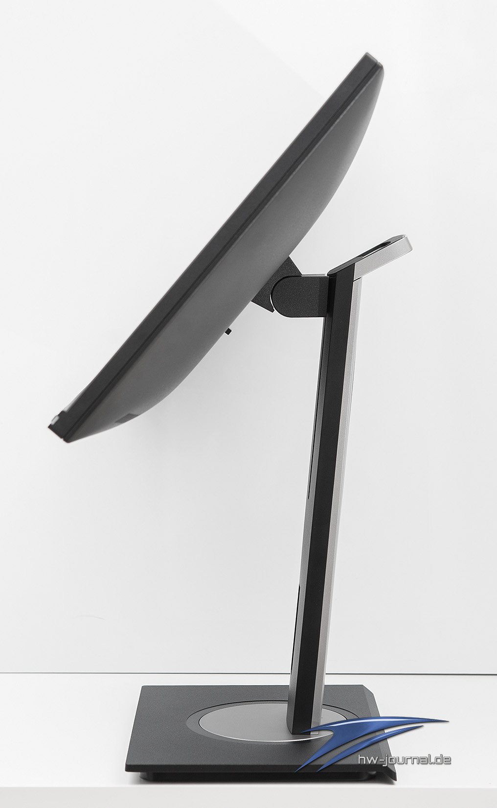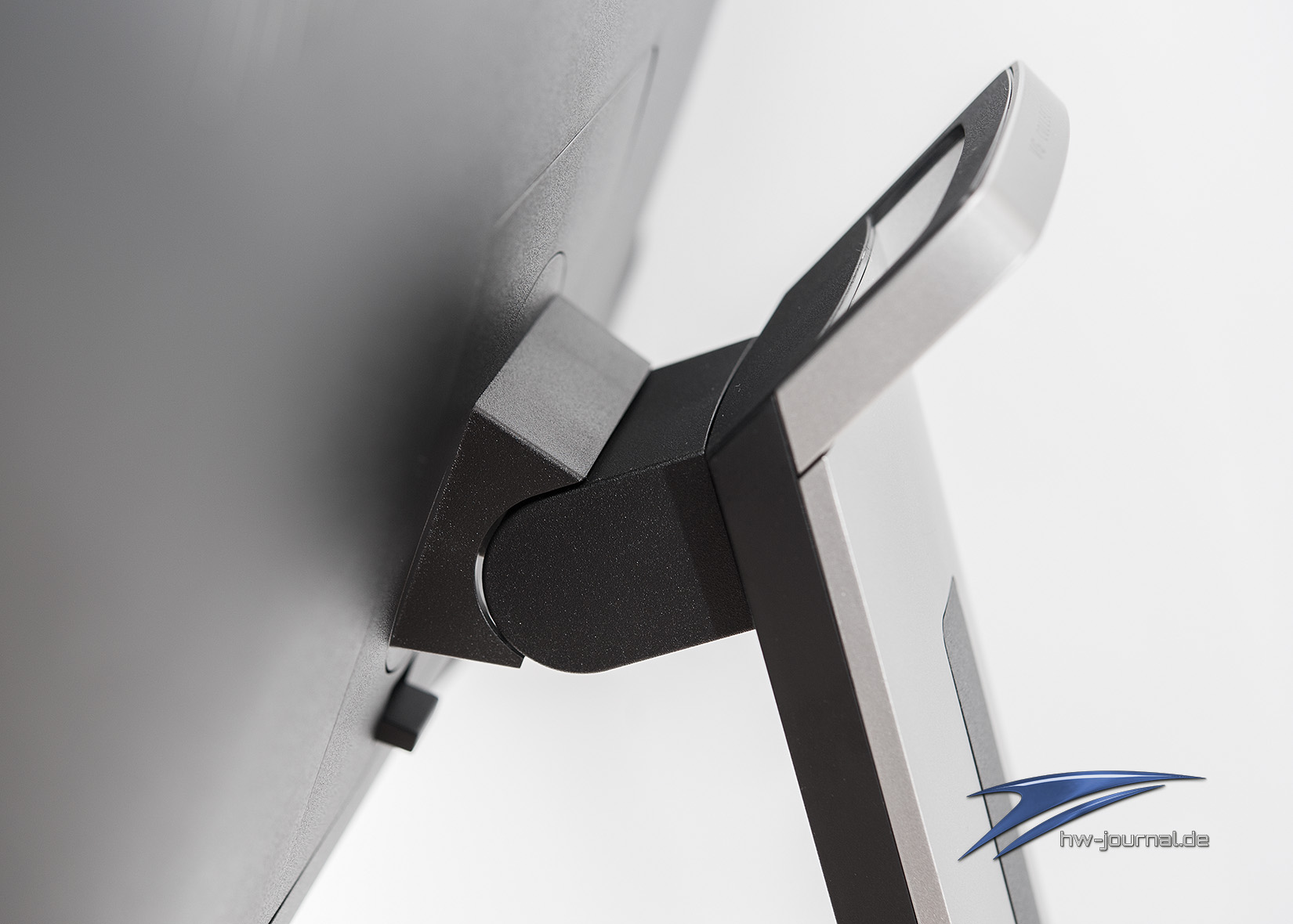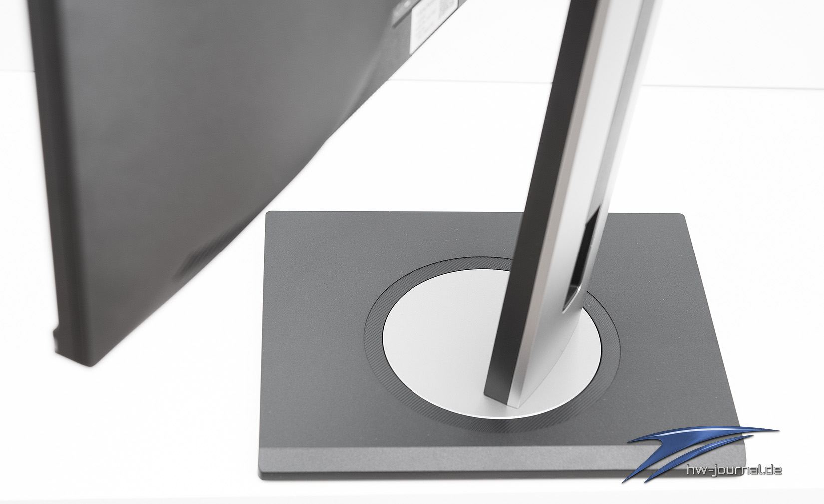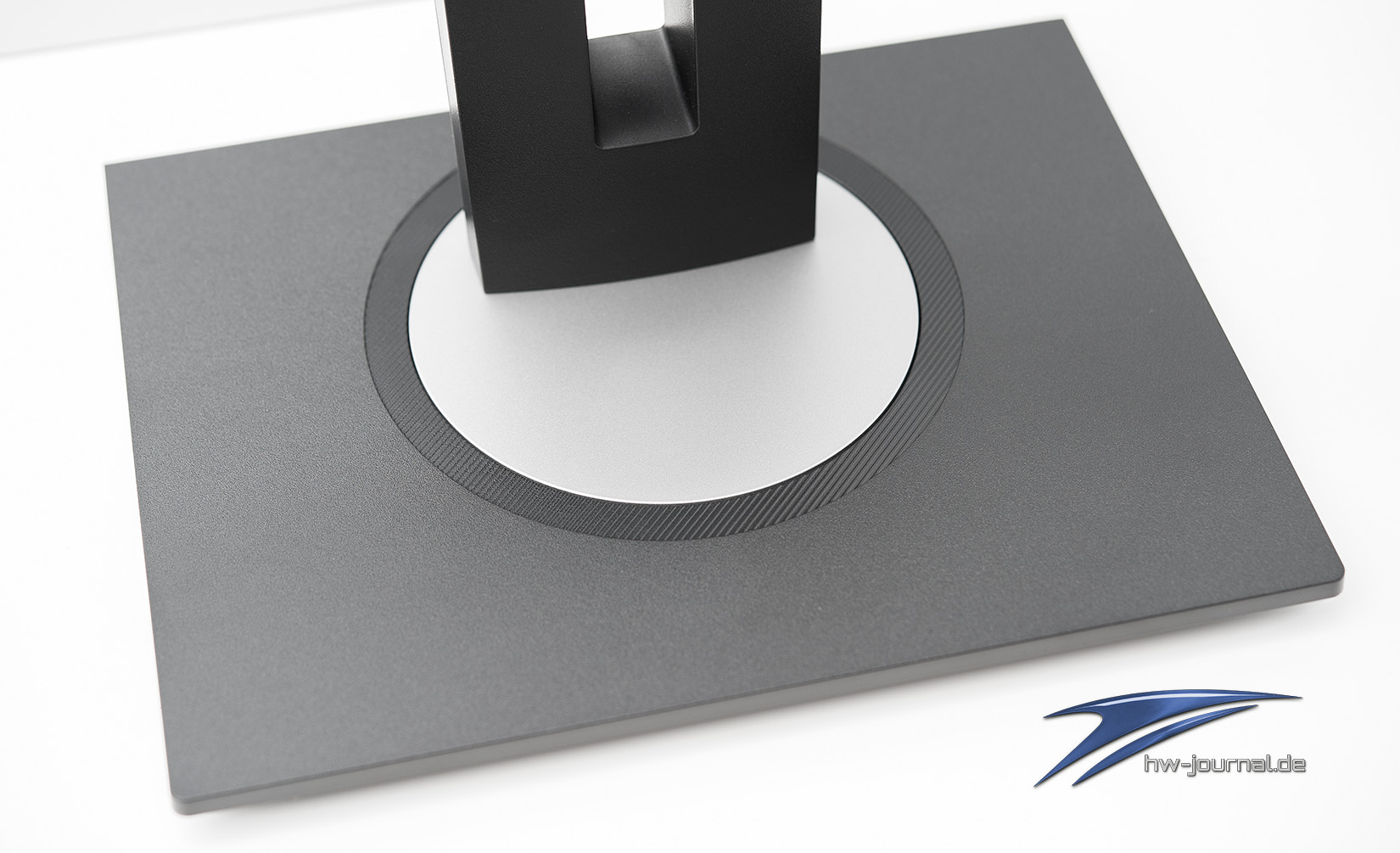Die Oberfläche des Kunststoffs ist mattiert und weißt eine minimal fühlbare Oberfläche auf, die glücklicherweise keine Fingerabdrücke speichert und einen sehr robusten Eindruck hinterlässt. Um das Panel mit dem Standfuß zu verheiraten, ist nicht viel technisches Verständnis nötig. Der Standfuß selbst wird mit dem Gestell und einer Flügelschraube zusammengehalten, die dann in die Displayaussparungen auf der Rückseite eingeklippt werden - eine effektive und simple Lösung. Der sehr stabile Standfuß besitzt dieselbe wertige Oberfläche, wie sie auch beim Display Verwendung findet und fügt sich dem ansprechenden Erscheinungsbild. Für optische Akzente sorgt die drehbare Platte im Standfuß, die neben dem silberfarbenen Look auch einen äußeren Ring mit anderer Oberflächenstruktur beherbergt. Für einen „einfachen“ Office-Monitor durchaus schöne Lösung, lässt das Gerät schlank und hochwertig auf dem Schreibtisch erscheinen.