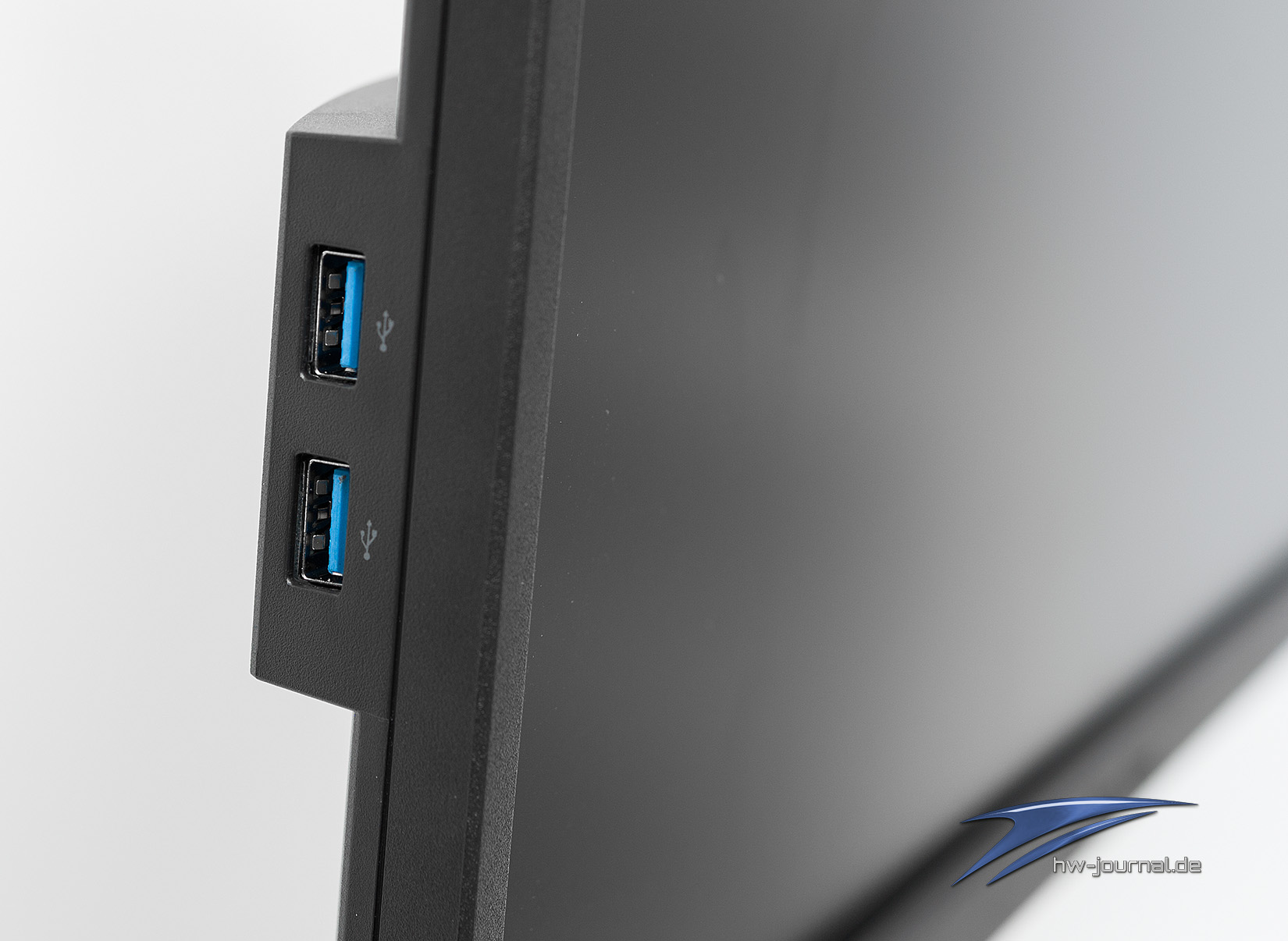 Um mit dem Bildschirm in Kontakt treten zu können, setzt Viewsonic auf aktuelle Standards. Mit jeweils einem Display-Port, HDMI- und VGA-Anschluss sollte für jeden Bürorechner die richtige Kommunikationsschnittstelle für eine Bildwiedergabe vorhanden sein. Zusätzlich hat Viewsonic noch einen USB-Hub im Bildschirm untergebracht, der vier USB-3.0 Anschlüsse bereitstellt. Für die Erreichbarkeit wurden zwei dieser Anschlüsse auf die linke Seite im Rahmen integriert, die anderen beiden sitzen neben den restlichen Schnittstellen auf dem Anschlusspanel.