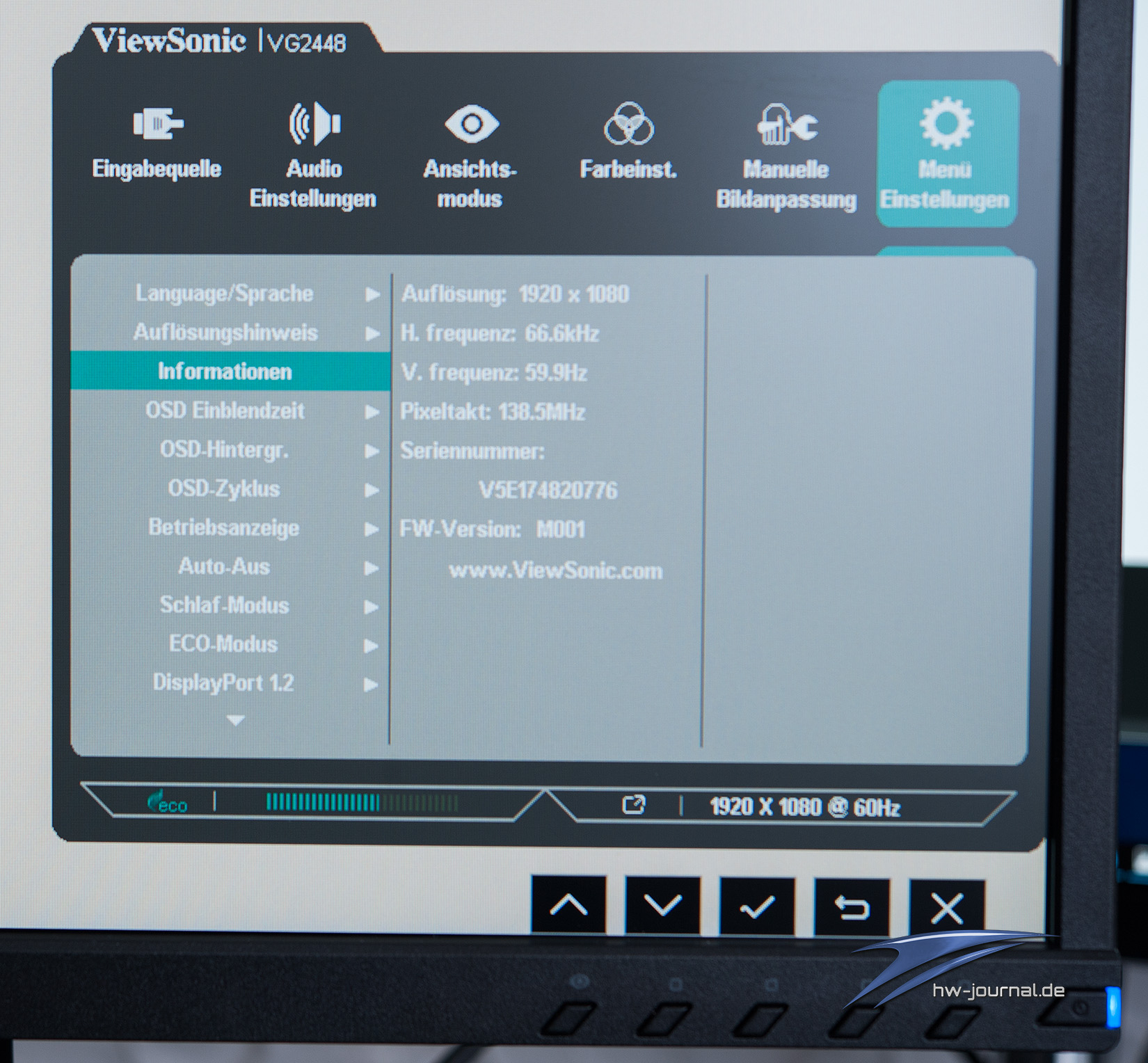 Bei der Steuerung setzt Viewsonic auf ein On-Screen Menü mit vielen Funktionen. Dadurch dass das Display direkt über den Menü-Tasten die aktuelle Funktion anzeigt, ist das Navigieren im Menübaum ein Kinderspiel. Das Menü selber ist sehr umfangreich und bietet einige Anpassungen für den geneigten Nutzer. Die Farbanpassung kann in den jeweiligen Farbtönen einzeln justiert werden oder man greift auf die vordefinierten Presets wie Office, Film oder Spiel zurück. Dazu können auch eigene Vorlieben über Presets-Slots gespeichert werden. Auch Einstellungen wie der Ansichtsmodus, manuelle Farbmodus oder Bildeinstellungen wie Overscan oder Schärfe sind möglich. Jeden Menüpunkt einzeln aufzulisten, würde aber den Rahmen sprengen, kann aber im Handbuch (Download-Link) detailliert nachgelesen werden.