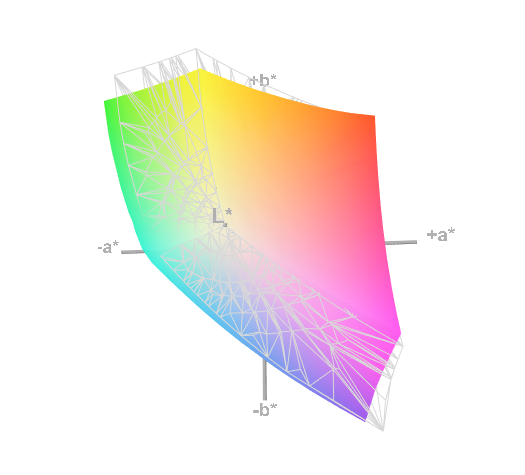Wie gut die Darstellung des sRGB-Farbraum vom jeweiligen Monitor abgebildet werden kann, kann von unseren 3D-Grafiken abgelesen werden. Die Messergebnisse werden dazu in einem sogenannten ICC-Profil abgespeichert und so können wir mit einem entsprechendem Viewer (ICC-View) ein Modell dazu erstellen. Es kommt wieder das bereits o.g. genannte Normlicht-Profil CIE Lichtart D65 bei 160cd/m² sowie eine Leuchtdichte nach ISO 3664 condition P2 zum Einsatz. Die Tonwertkorrektur wird mit dem 2.2 Gamma-Standardprofil versehen.