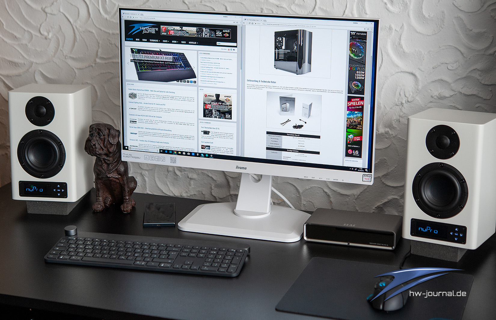 Für einen Check unter realen Bedingungen verfassten wir den Testbericht auf dem Iiyama und nutzten ihn im täglichen Geschäft eines Redakteurs. Mit einer Pixeldichte von knapp 108 PPI im Seitenverhältnis 16:9 bewegt sich der Monitor in einem angenehmen Bereich zum Arbeiten. Die Darstellung haben wir subjektiv sehr angenehm empfunden und Auflösung und Panelgröße sind recht harmonisch. Dazu stellt das matte IPS-Panel Schriften auf Websites oder Dokumenten ausreichend scharf dar und die zur Verfügung stehende Arbeitsfläche ist völlig ausreichend für Office-Anwendungen oder einfache Bildbearbeitung. Liegt die persönliche Präferenz bei Multitasking und dem Hantieren mit vielen Fenstern gleichzeitig, ist der Iiyama XUB2792QSU sicherlich nicht die erste Wahl, aber bietet einen guten Kompromiss aus Arbeitsfläche und Größe des Monitors. Für mehr Fläche würde sich ein weiteres Modell anbieten, ein Multi-Monitor-Setup gibt der schmale Rahmen jedenfalls her.