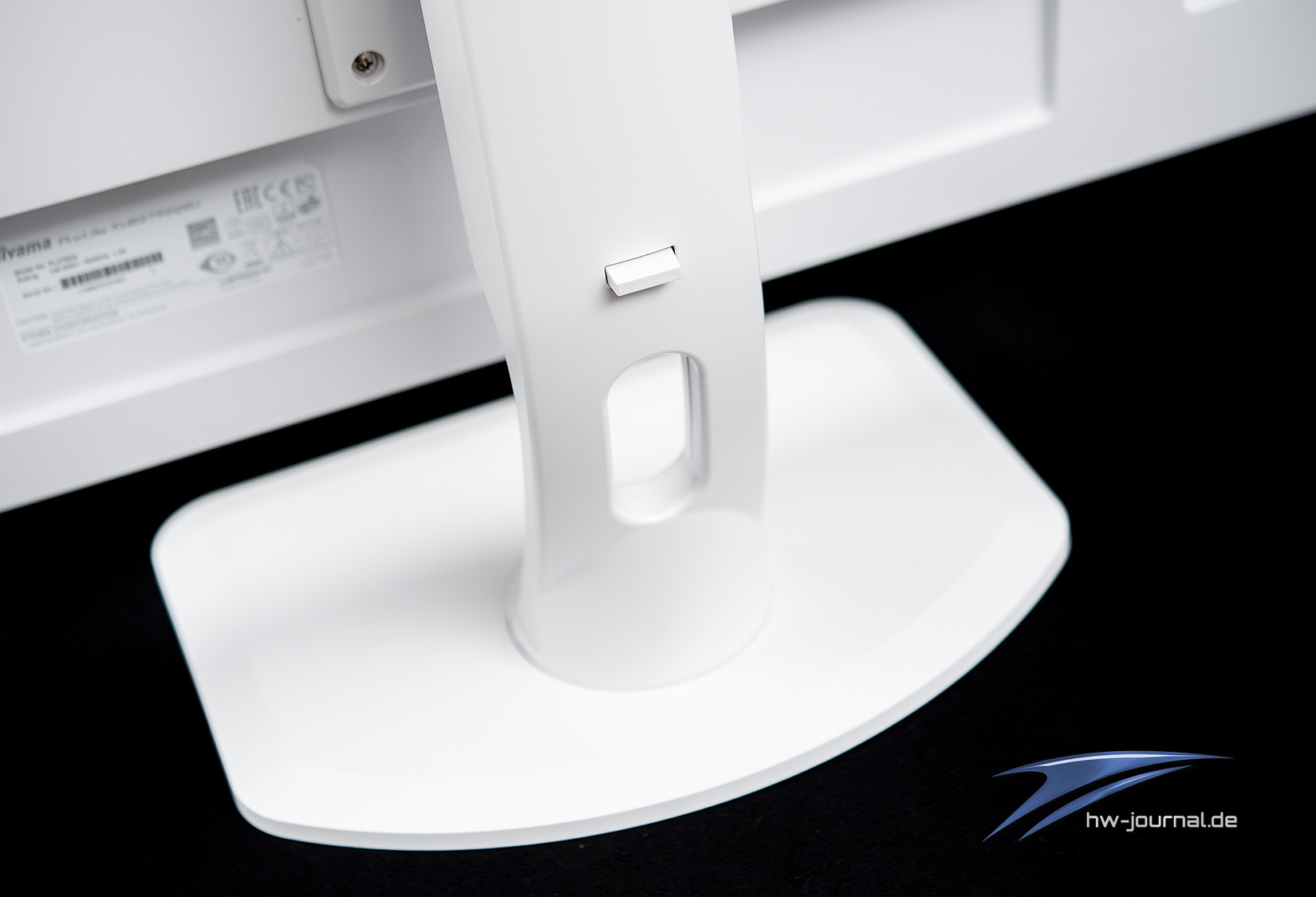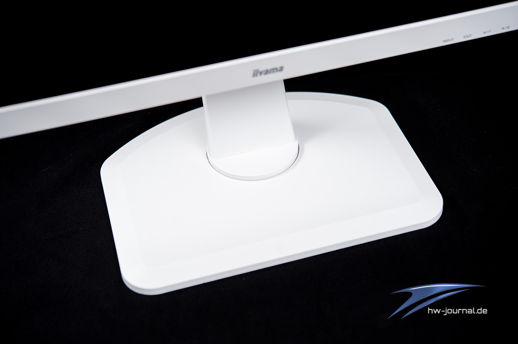 Um den Monitor aufstellen zu können, muss man einen Schraubenzieher parat haben. Denn im Gegensatz zu der üblichen Klickmechanik, wie wir sie von einigen LG Modellen kennen, muss der Standfuß, nachdem man ihn mit dem Sockel verbunden hat, mit dem Panelgehäuse fest verschraubt werden. Ist aber selbst für Laien mit zwei linken Händen innerhalb von fünf Minuten zu bewerkstelligen. Der stabile Standfuß ist im Kern aus Metall gefertigt, für die bessere Optik aber mit dem gleichen Kunststoff, wie er auch beim Gehäuse zum Einsatz kommt, überzogen. Optische Akzente sucht man bei diesem Iiyama Modell aber vergebens, die Farbsprache ist einheitlich, schlicht aber wertig gehalten.