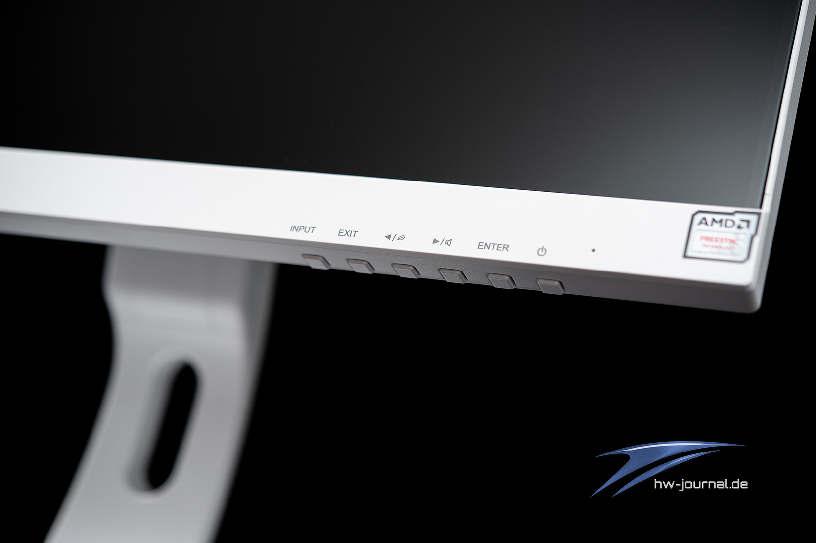 Das matte Display wird von einem kaum sichtbaren, 2 Millimeter breiten Rahmen eingefasst und nur der untere Bereich des Rahmes ist mit einer Dicke von fast drei Zentimetern, auch als solcher zu bezeichnen. Das flache Frontdesign und der schon erwähnte schmale Rahmen unterstreichen die Eignung des Monitors für eine Multimonitor-Anordnung. Neben dem grauen Firmenlogo auf dem unteren Rahmenbereich, ist das Bedienpanel untergebracht. Dieses besteht aus fünf Funktionstasten, die für die Menüsteuerung benötigt werden und einen zusätzlichen Power-Schalter, der seinen Betrieb durch eine blaue LED signalisiert.