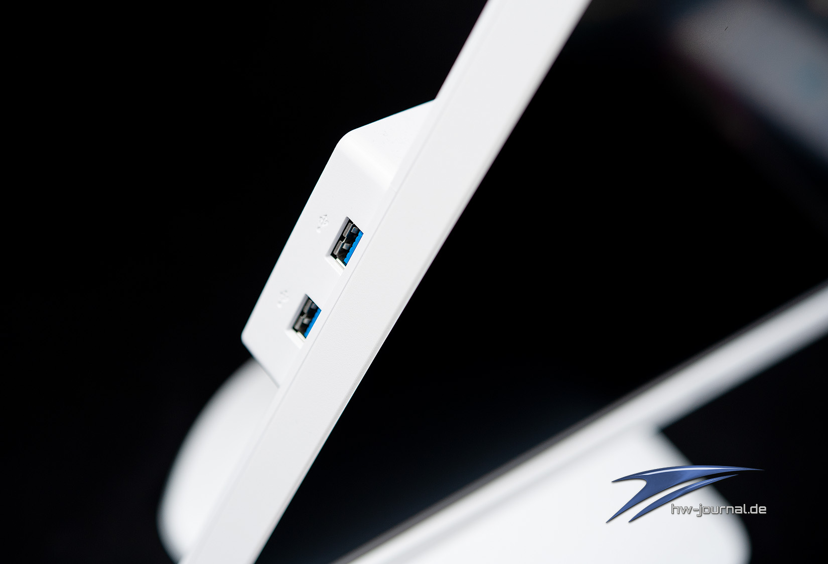 Für die Kommunikation steht einiges an aktuellen Standards zur Verfügung. Neben dem Display-Port, stehen dem Nutzer ein HDMI- und VGA-Anschluss zur Verfügung und somit alle gängigen Anschlussmöglichkeiten. Im Gegensatz zum kleineren XUB2492HSU Modell, setzt man auf einen USB-Hub mit aktuellen 3.0 Übertragungsstandard. Diese sind auch deutlich einfacher zu erreichen, da sie seitlich am Gehäuse rausgeführt werden.