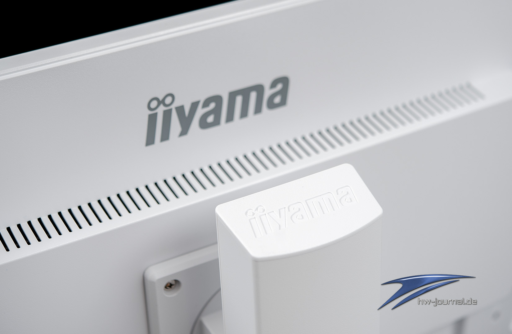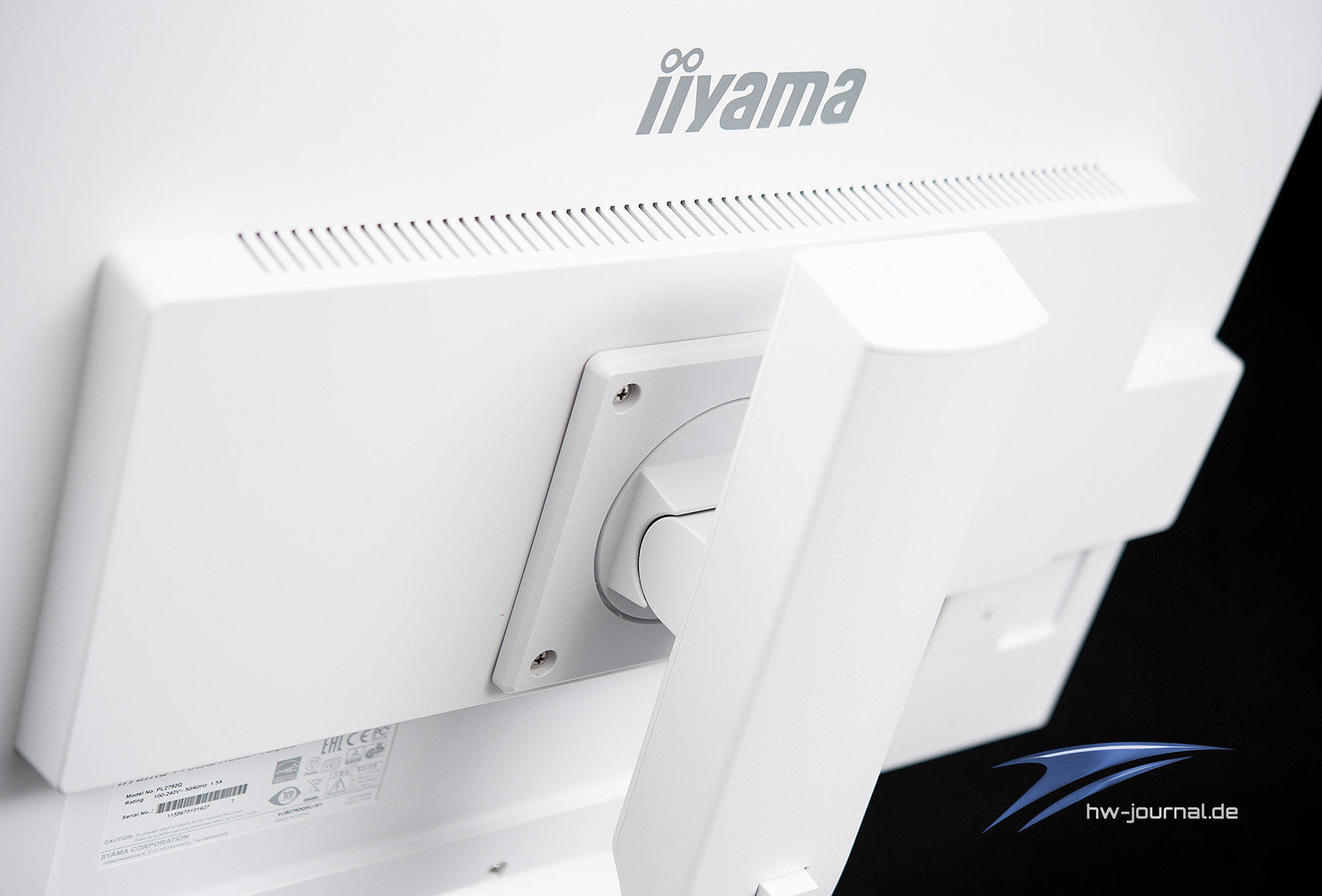 Auch die Rückseite des Dispaly spricht eine schlichte Designsprache und bietet neben dem großen eingelassenen Logo, keinen Hingucker. Iiyama verzichtet bewusst auf farbliche Akzente, möchte man doch den „betrieblich“ gewünschten Dresscode einhalten. Wer sich mit dem Standfuß nicht anfreunden kann und lieber eine Wandmontage bevorzugt, für den besitzt der Monitor den marktüblichen VESA Standard von 100 x 100 Millimeter.
