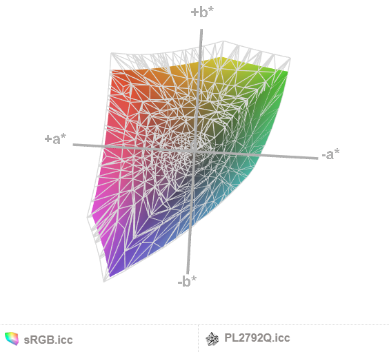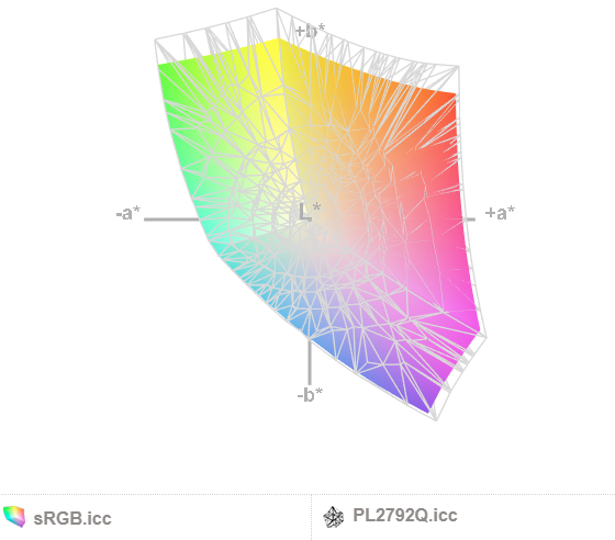 Wie gut die Darstellung des sRGB-Farbraum vom jeweiligen Monitor abgebildet werden kann, kann von unseren 3D-Grafiken abgelesen werden. Die Messergebnisse werden dazu in einem sogenannten ICC-Profil abgespeichert und so können wir mit einem entsprechendem Viewer (ICC-View) ein Modell dazu erstellen. Es kommt wieder das bereits o.g. genannte Normlicht-Profil CIE Lichtart D65 bei 160cd/m² sowie eine Leuchtdichte nach ISO 3664 condition P2 zum Einsatz. Die Tonwertkorrektur wird mit dem 2.2 Gamma-Standardprofil versehen.