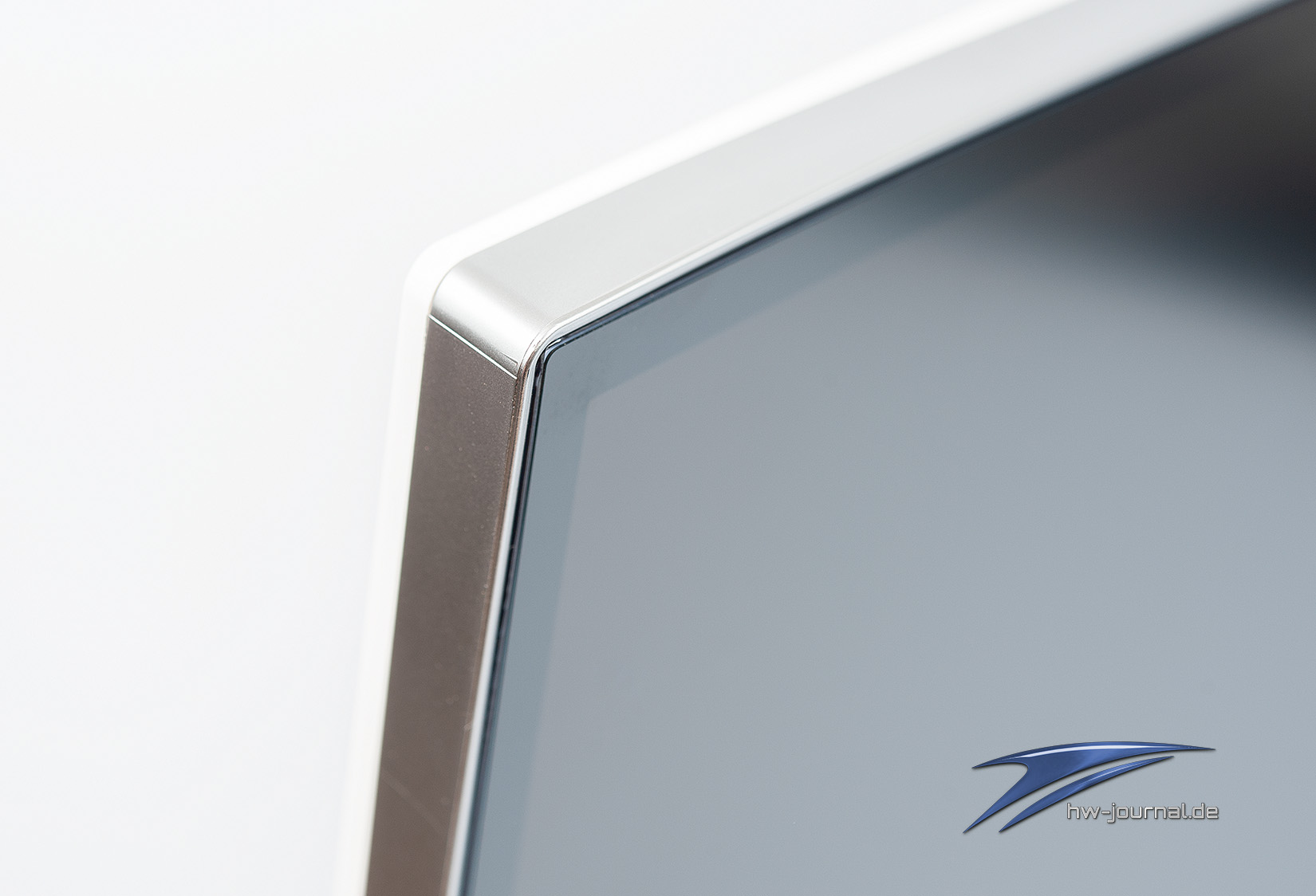Das von vorne betrachtet schwarz gehaltene Design, wird von einem silberfarbenen Rahmen eingefasst, zu dem auch der gebogene Standfuß perfekt passt. Die schwarzen Bereiche der Front sind aus mattschwarzen Kunststoff und der Rahmen für das Panel ist nur hinter dem Glas zu erahnen. Bis auf den unterhalb angebrachten Kunststoffstreifen, sitzt das Panel „rahmenlos“ in der Front, jedenfalls optisch. Diese cleane Optik hinterlässt einen hochwertigen Eindruck, welches auch die gut gewählte Materialqualität und Verarbeitung unterstreicht.
