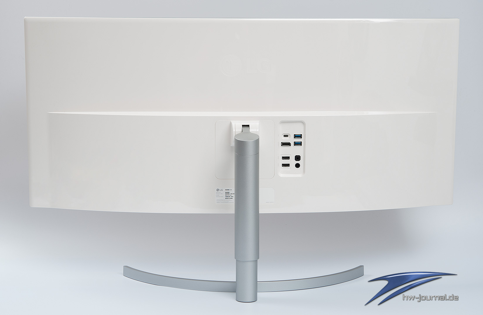 Im Gegensatz zu der eher dunklen Vorderseite, bildet die Rückseite einen stimmigen Kontrast mit ihrer weißen Farbgebung. Die leicht cremefarbige Oberfläche ist auch mit einer matten Oberfläche ausgestattet, sehr wertig verarbeitet und gefällt deutlich besser als die hochglänzenden Modelle wie z.B. der LG 38UC99-W. Zur Kommunikation stehen am 38WK95C einige Schnittstellen zur Verfügung. Neben dem Display-Port und zwei HDMI-Schnittstellen, steht auch ein Kopfhöreranschluss dem Nutzer zur Verfügung. Zusätzlich besitzt das LG Modell einen USB-Hub, mit zwei USB-3.0 Anschlüsse und als Besonderheit den Upstream mittels einen USB-C Anschlusses bereitstellt.
