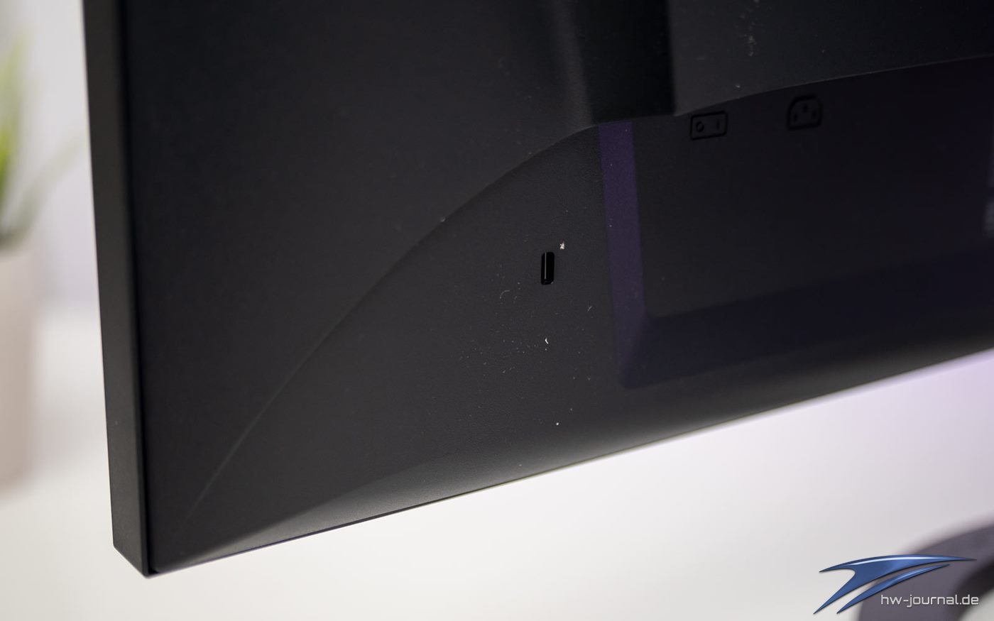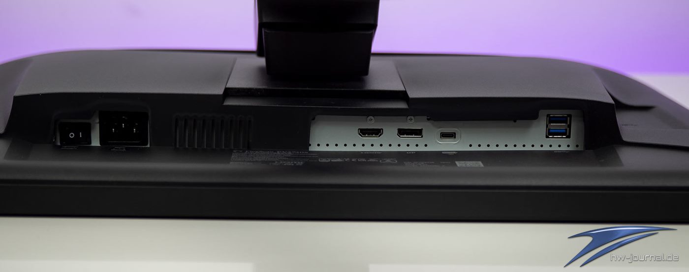 Die primären Anschlüsse sind an der Rückseite nach unten ausgeführt. Weitere Stecker in Form von gleich einem 3,5 mm Klinkenstecker und drei USB-A 3.0-Port befinden sich an der Seite. Nach unten hin ausgeführt findet man einen HDMI (1.4) Port, 1x DisplayPort (1.3), 1x USB-C mit 5gbit Upstream-Geschwindigkeit und einen weiteren USB-A 3.0-Port. Der USB-C-Anschluss bietet zudem auch noch ein Power-Delivery von bis zu 70 Watt, womit man dann beispielsweise ein angeschlossenes Notebook laden kann.