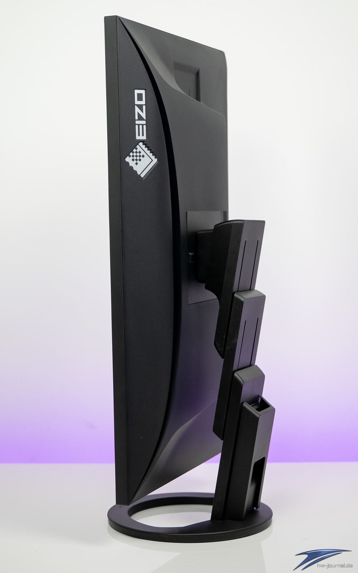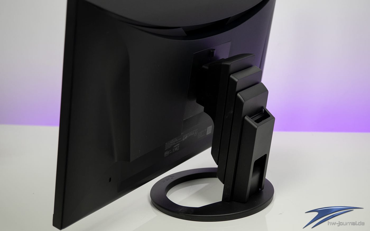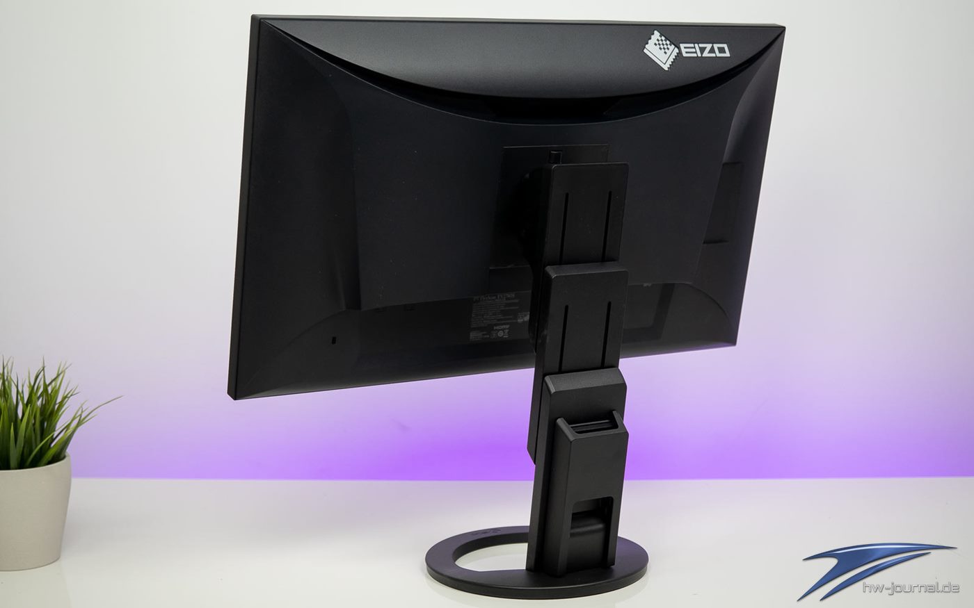 Sehr erfreulich ist auch wieder der Umstand, wie bei fast allen EIZO-Monitoren, dass das Netzteil intern verbaut wurde und man dadurch keinen externen „Klotz“ zu verstauen hat. Einen dedizierten Ein-Aus-Schalter gibt es ebenfalls noch. Für die angeschlossenen Kabel gibt es eine kleine Führung, durch die sie geordnet verlegt werden können.