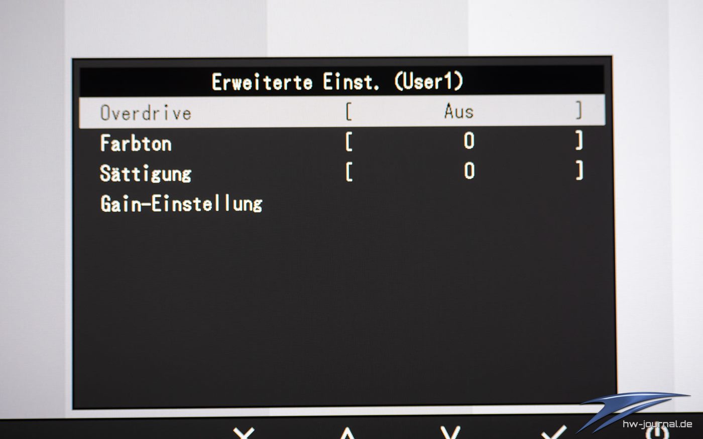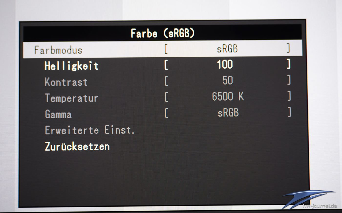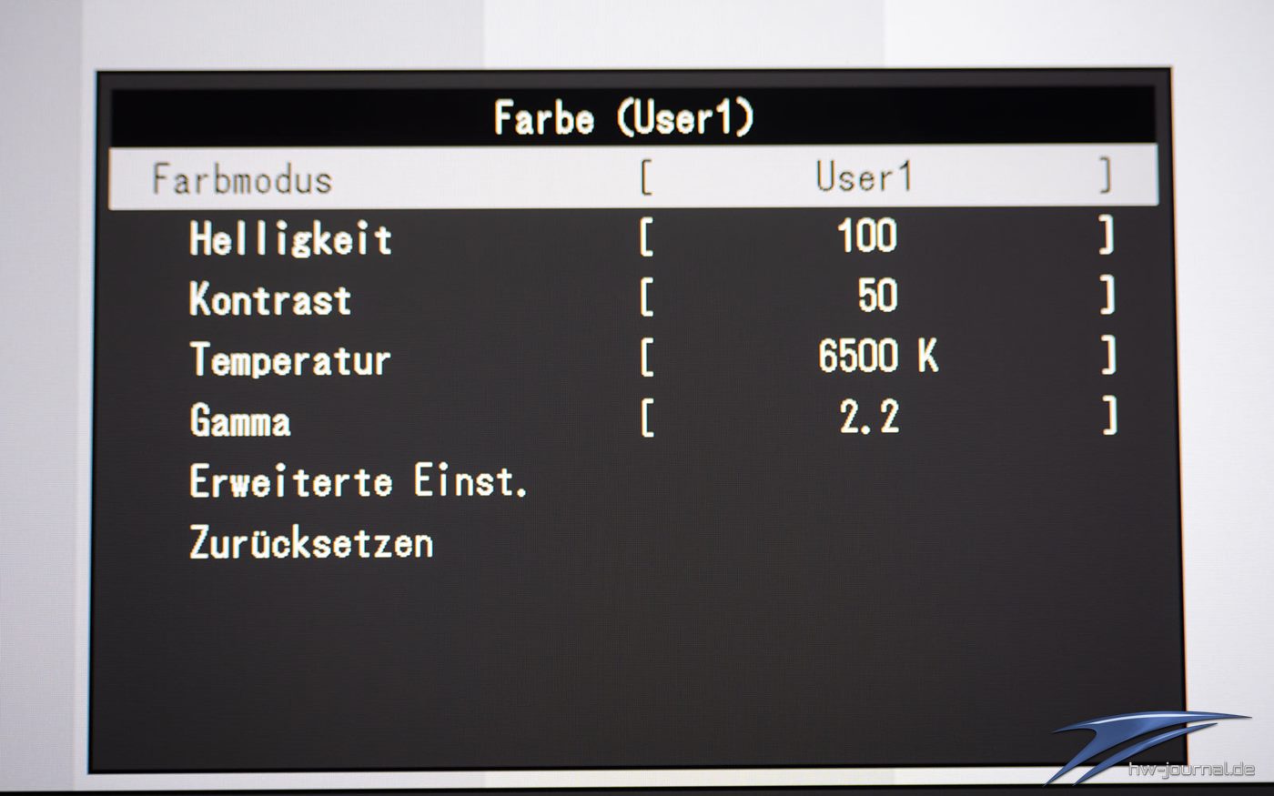 Die Oberfläche des Menüs selbst ist intuitiv, der Kontrast aus dunklem Hintergrund und heller Schrift bietet eine gute Lesbarkeit und es stehen dem Nutzer viele Einstellungen zur Verfügung. Für die Farbwiedergabe stehen die vorgefertigten Modi sRGB, USER1, USER2, Paper, Movie und DICOM. Aber auch Funktionen wie ECO, Overdrive, Interpolation, OSD-Sprachen werden hier angeboten und lassen keine Wünsche offen.