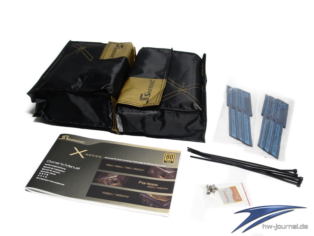 Inzwischen sollte bei fast allen Anwendern angekommen sein, dass Seasonic für Exklusivität auf bezahlbaren Level steht. Entsprechend dieser Vorgabe, fällt auch der Lieferumfang des X-1050 aus. In dem schicken Karton finden sich eine Menge Beigaben, die nicht nur schick aussehen sollen, sondern auch nützlich sind. Das Netzteil selbst wurde in einem edlen Stoffbeutel gepackt, welcher das Gehäuse vor äußeren Einwirkungen schützen soll. Hinzu gesellen sich die Anschlusskabel, die der Hersteller ebenfalls in einer separaten Aufbewahrungstasche mitliefert.