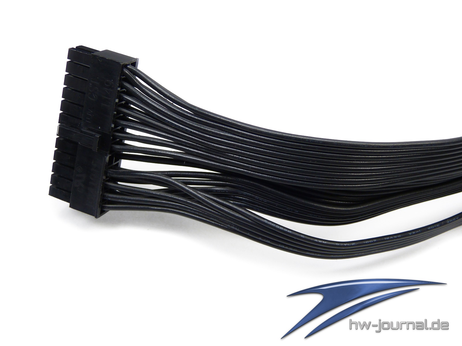 Bei der European-Serie kommen die schon oftmals gesehenen Flachbandkabel zum Einsatz. Neben Thermaltake macht dies auch Cooler Master mit dem V450S. Alle Kabel weisen eine ausreichende Dimensionierung auf. Der rund 62 Zentimeter lange ATX-Anschlussstrang wurde ebenfalls diesem „Verfahren“ unterzogen. Der Stecker ist leider nicht von 24 auf 20+4 Pins trennbar.