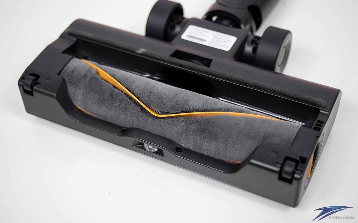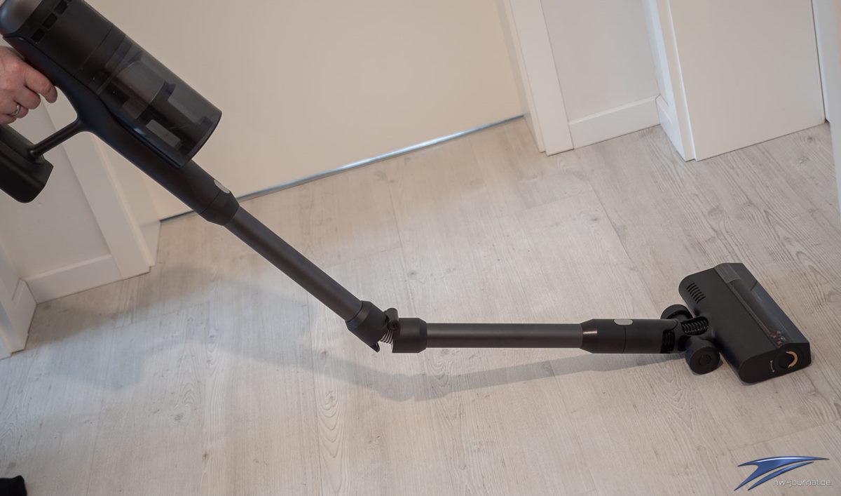 Gut umgesetzt ist das knickbare Rohr, wodurch der Rücken geschont wird. Man kann unter einem Sofa mit einem Bodenabstand von bis zu 8 cm saugen. Im ersten Moment wirkt die Konstruktion ein wenig instabil. Nach mehrmaligem Benutzen allerdings wächst dann aber das Vertrauen in die Technik. Diesen Ergonomiegewinn möchte man dann im Alltag nicht mehr missen. Apropos Ergonomie: Die Gewichtsverteilung im Handteil ist gut gelöst. Das Gewicht fällt nicht negativ auf. Über die gesamte Akkulaufzeit wird einem weder die Hand schwer noch verliert man die Kontrolle über die Bewegung der Bürste. Dazu trägt auch die sanft gleitende Rollenkonstruktion der Hauptbürste bei, bei der wir gar keinen Widerstand feststellen konnten.