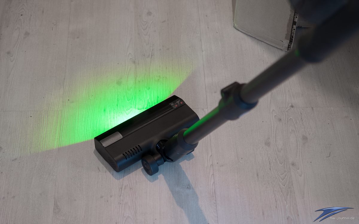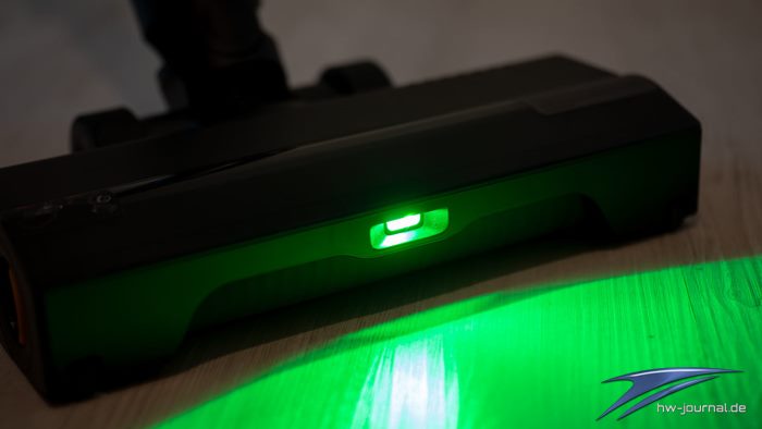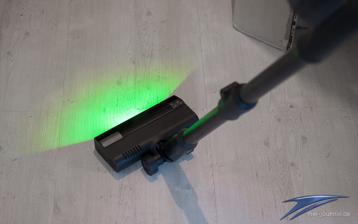 Zudem verfügt das Gerät über eine praktische LED-Beleuchtung an der Bodendüse, die auch dunkle Ecken und unter Möbeln gut ausleuchtet. Diese ist in der Mitte angebracht und leuchtet einen Winkel von 140 Grad aus. Durch das grüne Licht wird der komplette Boden vor dem Sauger ausgeleuchtet und Staub und Schmutz werden so leicht erkennbar. Preislich sprechen wir aktuell von 350 Euro (UVP). Es gibt auch noch eine weitere Version, den Roborock H60 Hub Ultra. Dieser kommt mit einer Station zum Verstauen des Zubehörs sowie einer Absaugeinheit daher.