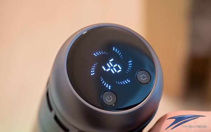 Das Gerät wird über Tasten an der Oberseite aktiviert. Direkt darüber befindet sich ein LED-Display, das Auskunft über den aktuellen Akkustand und den verwendeten Reinigungsmodus gibt. Die JawScrapers-Hybridbürste klingt zunächst wie aus einem Horrorfilm, nutzt aber ein geschwungenes Haifischzahn-Design, um Haare aufzunehmen und zu trennen. Das soll Verhedderungen reduzieren und damit Wartung und Pflege des Gerätes vereinfachen. Die Gummielemente lösen mit 7200 Schlägen pro Minute festsitzenden Schmutz und die weichen Borsten fegen diesen auf.
