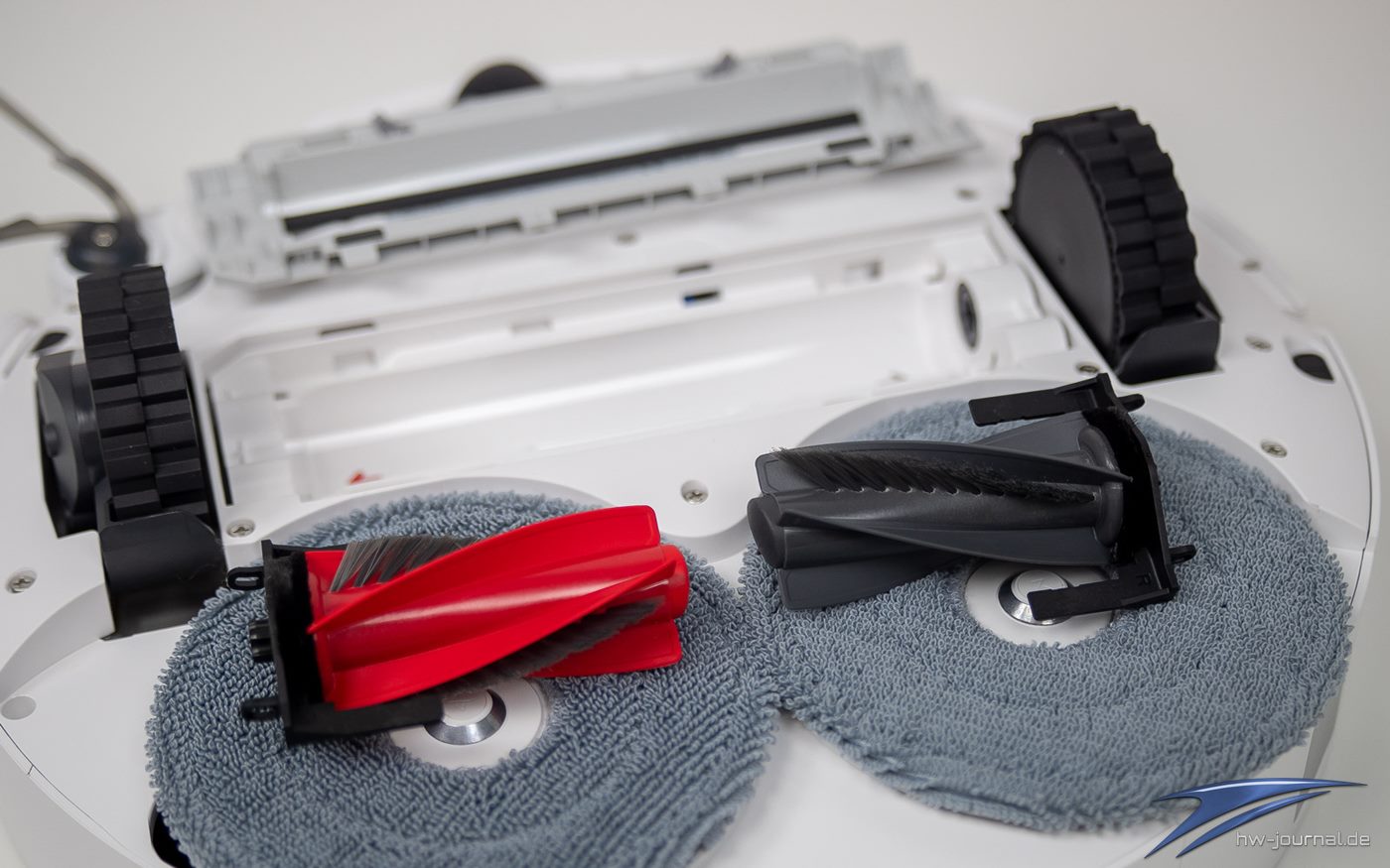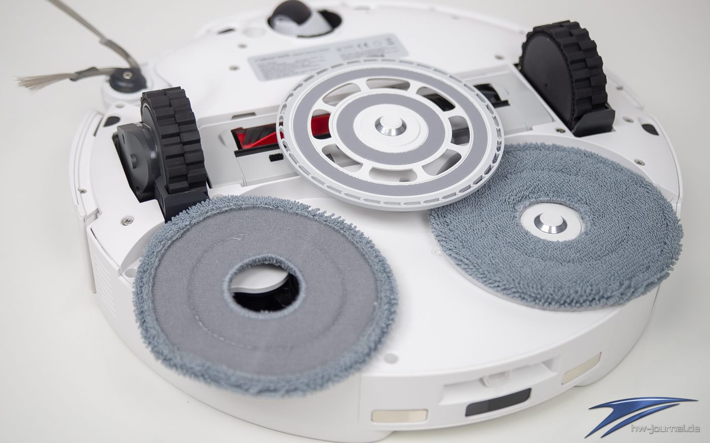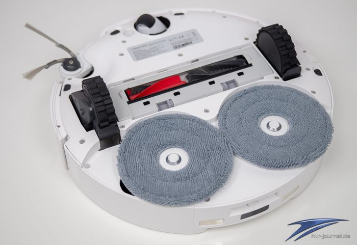 Trotz seiner enormen Saugkraft von bis zu 25.000 pa, soll das Gerät dennoch annehmbar in seiner Lautstärke agieren. Die Ecken- und Kantenreinigung ist durch ausfahrbare Mopps realisiert worden. Der Wassertank im Sauger selbst ist fest verbaut und man hat als Anwender keine Chance heranzukommen. Die beiden Mopps an der Unterseite halten branchenüblich per Magnet, die Reinigungspads lassen sich einfach entnehmen und auch reinigen.
