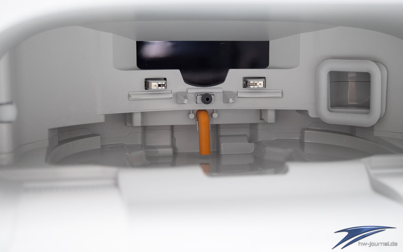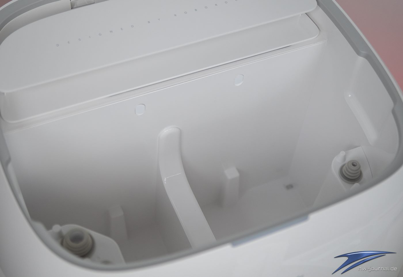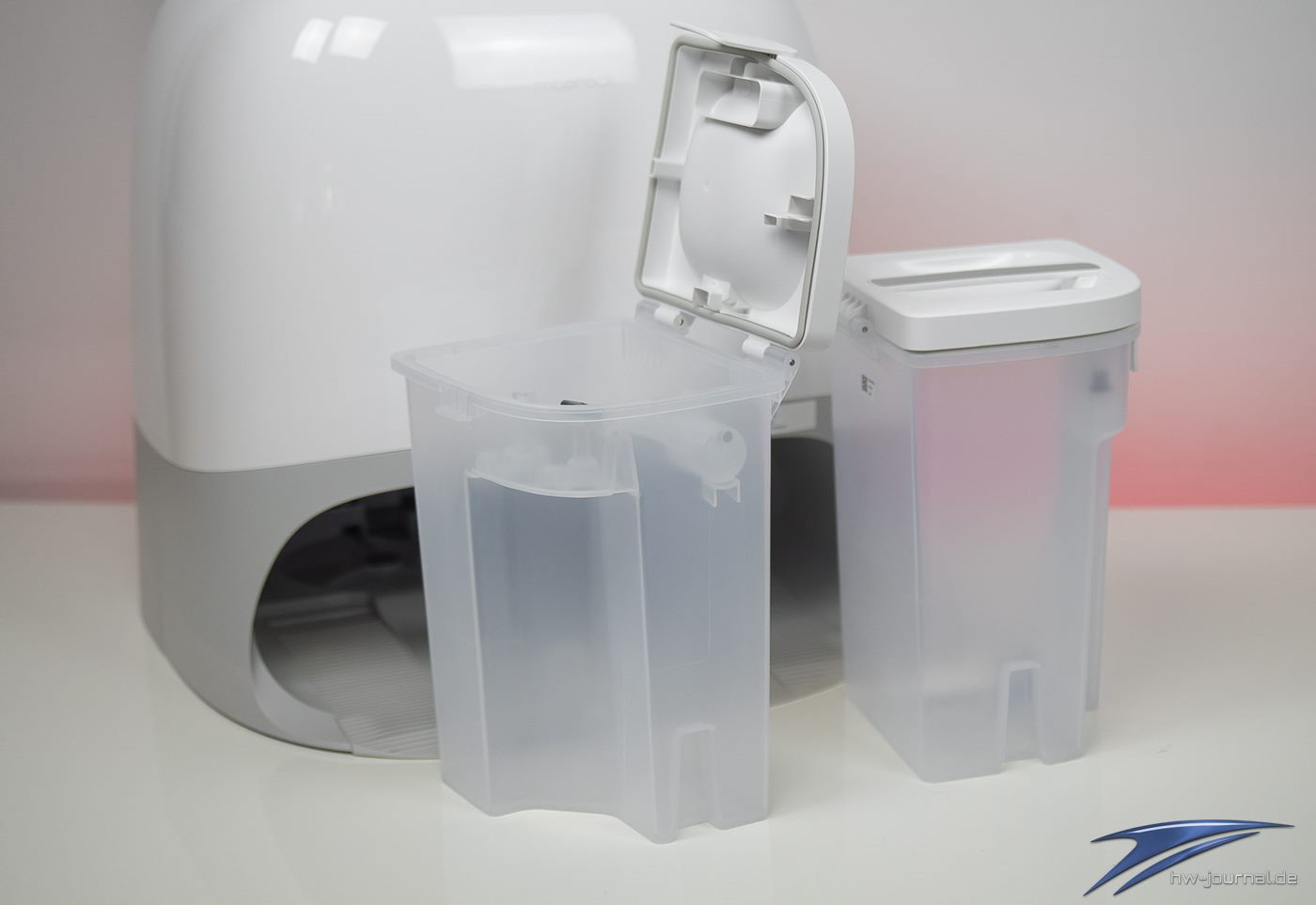Des Weiteren befinden sich in der Station befinden drei weitere Behälter (Frischwasser 4 L , Abwasser 3000L, Staubbeutel). Die beiden Wassertanks lassen sich leicht entnehmen. Der Staubbeutel hat ein Aufnahmevolumen von 2,5 Liter und ist vergleichsweise klein dimensioniert worden. Ein Kabelmanagement zum Verlegen des Stromsteckers ist leider nicht vorhanden.