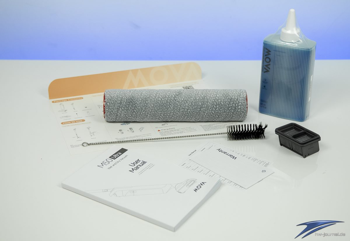 | ▪ Basisstation inkl. Netzteil ▪ Griff ▪ Hauptteil inkl. Walzenbürste, Frisch- und Schmutzwassertank ▪ 500 ml Reinigungsmittel ▪ Ersatzwalzenrolle ▪ Ersatzfilter ▪ Handbuch ▪ Reinigungsbürste |