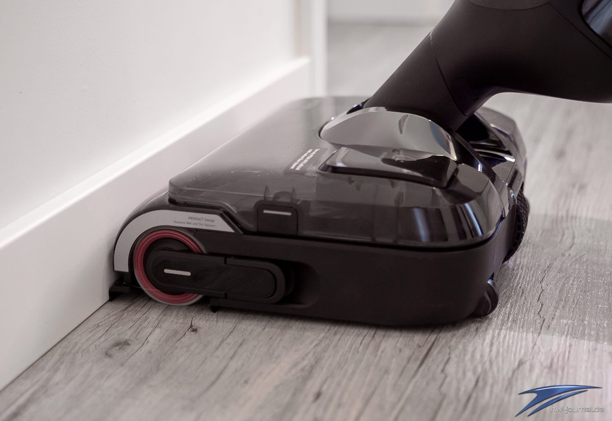 Im Bereich der Kantenreinigung ist die „die Lippe“, welche ausfährt, ein tolles Feature und garantiert sichere Reinigung an den Kanten und lässt keinen Wischbereich aus. Die Reinigung der Kante seitlich könnte mit einer zusätzlichen Lippe ausgestattet sein, was aber bei einem vorsichtigen Heranfahren an die Randleiste des Raumes nicht weiter einschränkt.
