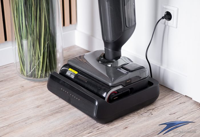 Nun einmal zu den kleinen Kritikpunkten: Der verbaute Akku ist leider nicht austauschbar und der Basisstation hätte ein Kabelmanagement gut zu Gesicht gestanden. Wer unter Möbeln wischen möchte, der muss darauf achten, dass die Durchfahrtshöhe von 15 cm nicht unterschritten wird, sonst passt es leider nicht mehr. Wer auf hohem Niveau meckern möchte, dass mit einem absenkbaren Griff dennoch nicht unter das abgehangene WC oder sehr niedrige Möbel kommt – liegt damit nicht ganz falsch. Das Gerät ist mit einer hervorragenden Akku-Leistung und einem großen Wassertank ausgestattet, was langes Reinigen ermöglicht. Die Reinigungsrolle ist einfach herausnehmbar, so wie auch die restlichen Teile des Wischers. Die 100 Grad heiße Selbstreinigung stellt ein weiteres tolles Feature dar, was den allgemeinen Arbeitsablauf bequemer macht. Der Haarauffang im Schmutzbehälter funktionierte und macht das Reinigen desselben leichter.