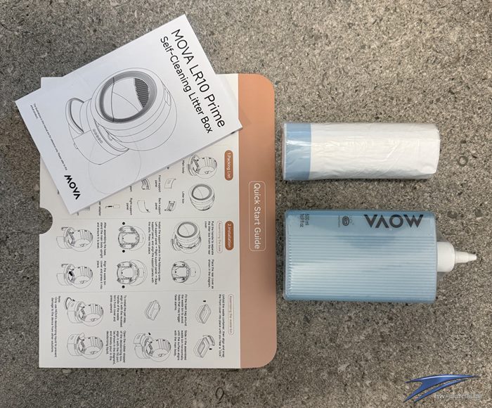 Der Lieferumfang des MOVA MeowgicPod LR10 Prime ist auf eine sofortige Inbetriebnahme ausgelegt. Neben der eigentlichen Katzentoilette enthält das Paket einen großzügigen Abfallbehälter mit 11 Litern Fassungsvermögen, der mit Hygienebeuteln ausgestattet wird. Für die Geruchskontrolle liegen ein Aktivkohlefilter sowie eine Lufterfrischerflüssigkeit bei.