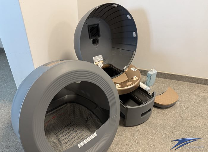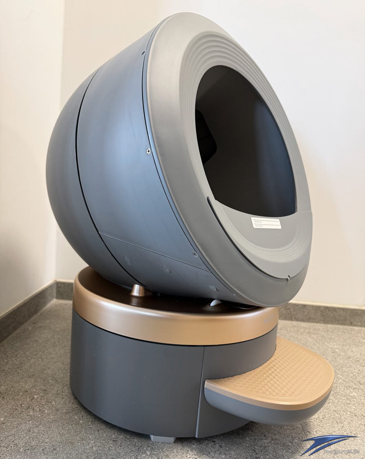 Das Katzenstreu liegt in einer speziellen Matte mit Antihaftbeschichtung, die gewechselt werden kann. Diese sorgt dafür, dass auch weiche Rückstände problemlos entfernt werden. Außerdem lässt sich in der App ein spezieller Modus für Tiere mit Durchfall aktivieren. Der Abfallbehälter befindet sich unterhalb der Kabine, versteckt in einem kleinen Podest für die gesamte Katzentoilette. Das Volumen soll bei einer Katze für 15 Tage ausreichen.