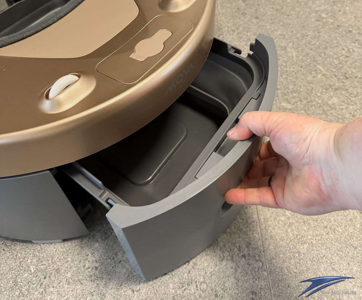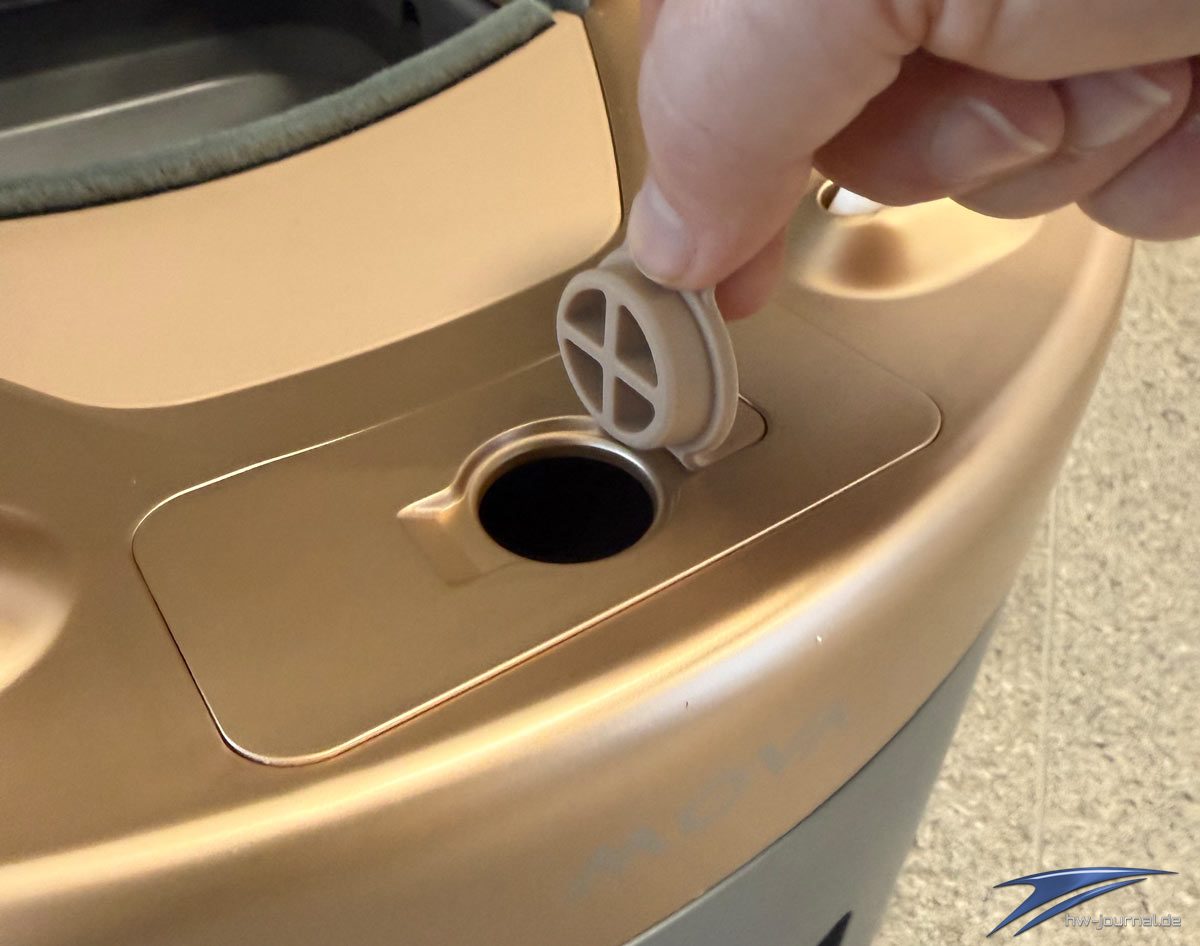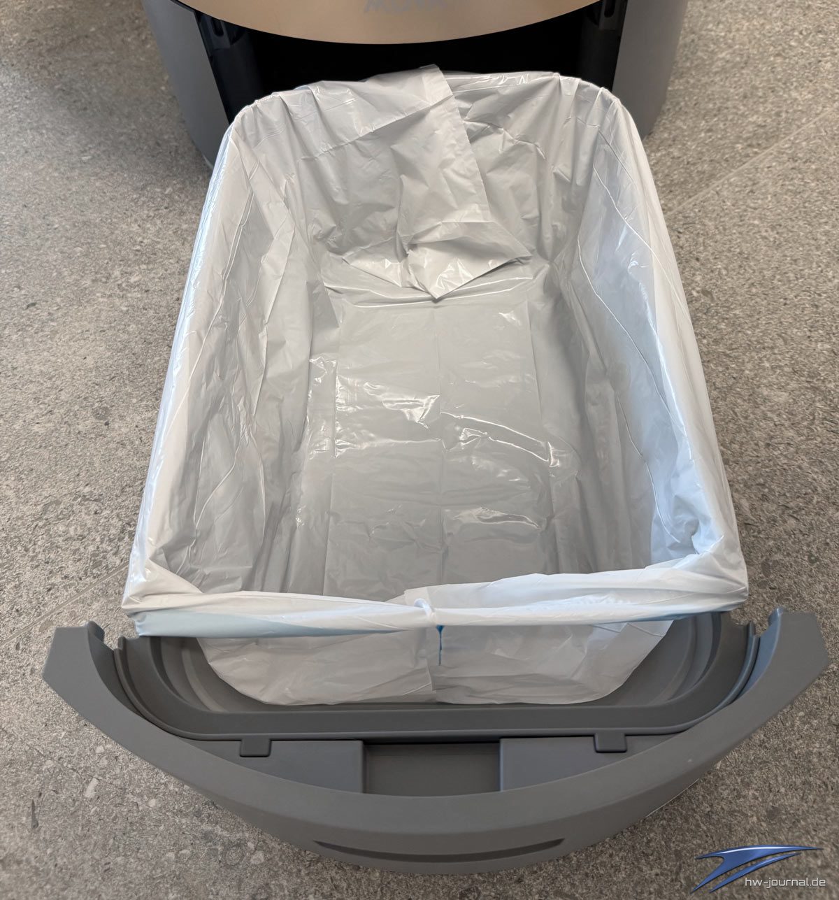 Unter der Kabine befindet sich eine Schublade, die Abfälle in einem 11-Liter-Behälter aufnimmt, der sich mit einem Handgriff herausziehen lässt. In dem Behälter kann jeder Müllbeutel auf dem freien Markt verwendet werden. Man ist nicht abhängig von den herstellereigenen Modellen. Das ist nämlich gar nicht unüblich bei entsprechenden Toiletten und ein nettes Zusatzgeschäft für die Hersteller. Ein großer Pluspunkt für das MOVA-Modell.