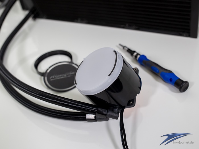 Wie man wieder unschwer erkennt, ist also auch bei der Gletscherwasser ein Material-Mix vorhanden. Der Korrosion wirkt der Hersteller mit einer Flüssigkeit von XSPC entgegen. Unter der Bezeichnung E10 konnten allerdings keine genaueren Infos herausgefunden werden. Ebenfalls für mehr Haltbarkeit soll der UV-Lack am Pumpengehäuse sorgen, welcher als besonders kratzfest beschrieben wird. Neu ist auf jeden Fall der Wechsel der Logo-Platten des Gehäuses. Hier lässt der Hersteller der Phantasie quasi freien Lauf, da auch eine unbedruckte Platte enthalten ist.
