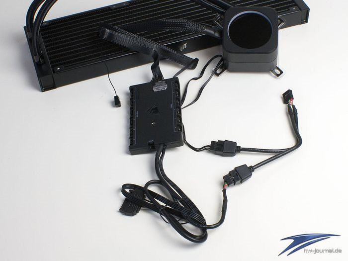 Angesteuert wird das Display über einen eigenen internen USB-Stecker. Da dem Lieferumfang auch hier ein Corsair Commander Core beiliegt, braucht es also insgesamt zwei Anschlüsse. Damit man auf dem Mainboard nicht gleich zwei USB-Header benötigt, liegt ein Y-Adapter bei. Der Anschluss der Wasserkühlung inklusiv Displaye ist gut gelöst, da die Anbindung zum Controller mit einem Kabel erfolgt und nicht mehr alle einzelnen Kabel der Beleuchtung und Lüfter zur Pumpe geführt werden müssen.